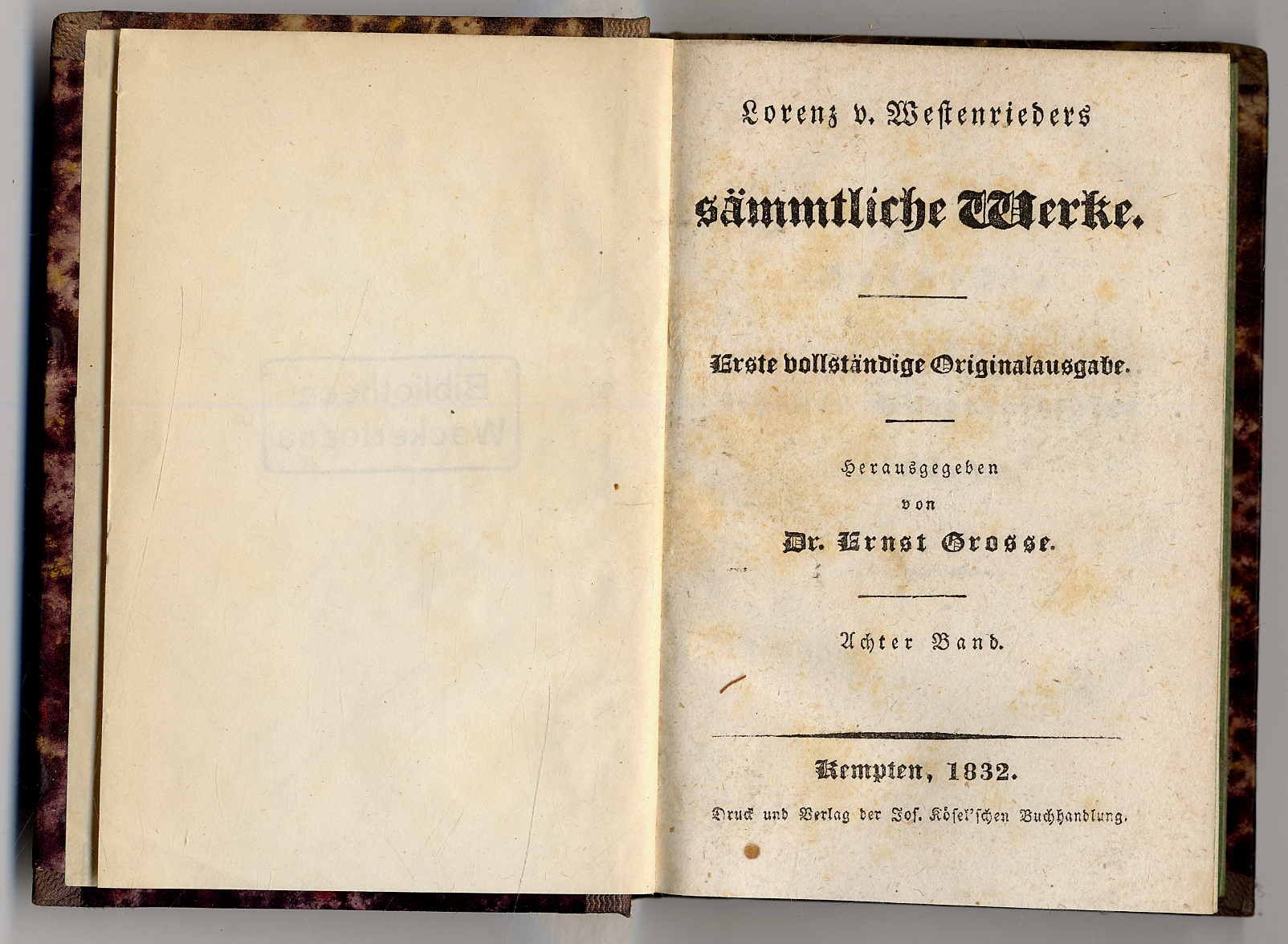 Westenrieder, Lorenz v.: Sämmtliche Werke. 8. Band. Erste vollständige Originalausgabe. Hrsgg. von Ernst Grosse. Kempten, Jos. Kösel’sche Buchhandlung, 1832. Ca. 13,5 x 9,5 cm. 304 Seiten. Halbleinenband der Zeit mit Rückenblind- und Rückengoldprägung. Einband etwas berieben. Vorsatz mit Stempel. Teils etwas stockfleckig, jedoch gutes Exemplar. Hier Band 8 (Geschichte der schönen Bürgerstochter von München) der gesammelten Werke des Theologen, Pädagogen, Historikers und Publizisten der Aufklärung Lorenz Westenrieder (1748-1829), der als Wiederentdecker der bayerischen Vorgeschichte und wohl bedeutendster literarischer Aufklärer des katholischen Deutschland gilt.