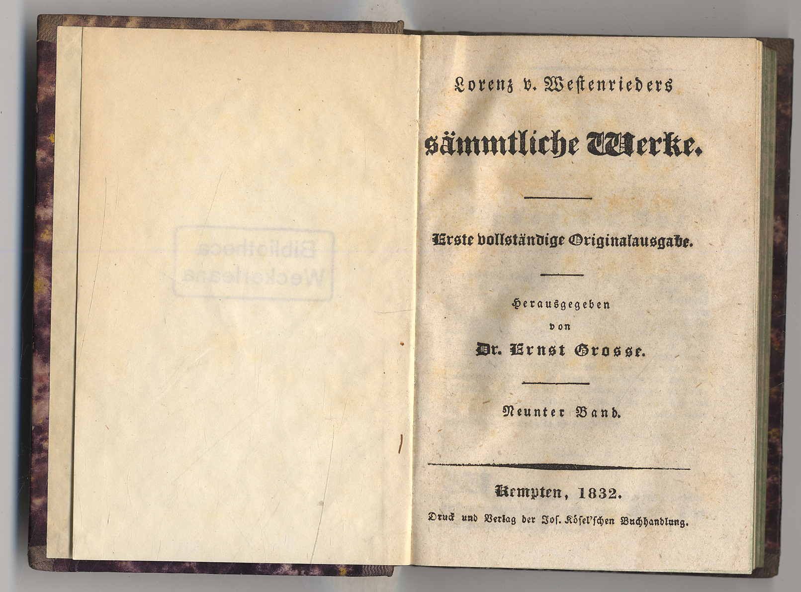 Westenrieder, Lorenz v.: Sämmtliche Werke. 9. Band. Erste vollständige Originalausgabe. Hrsgg. von Ernst Grosse. Kempten, Jos. Kösel’sche Buchhandlung, 1832. Ca. 13,5 x 9,5 cm. 319 Seiten. Halbleinenband der Zeit mit Rückenblind- und Rückengoldprägung. Einband etwas berieben. Vorsatz mit Stempel. Teils etwas stockfleckig, jedoch gutes Exemplar. Hier Band 9 (u.a.: Ueber die Ehe; Von dem Zustand der Musik in München; Zum Andenken grosser und guter Seelen) der gesammelten Werke des Theologen, Pädagogen, Historikers und Publizisten der Aufklärung Lorenz Westenrieder (1748-1829), der als Wiederentdecker der bayerischen Vorgeschichte und wohl bedeutendster literarischer Aufklärer des katholischen Deutschland gilt.