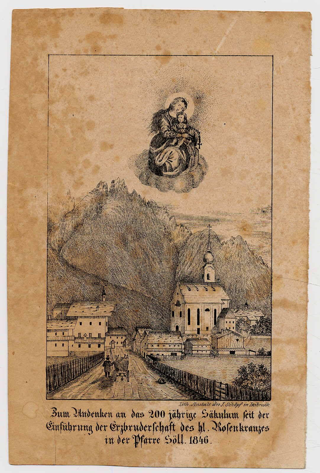 Söll – Zum Andenken an das 200jährige Säkulum seit der Einführung der Erzbruderschaft des hl. Rosenkranzes in der Pfarre Söll. Innsbruck, Lithographische Anstalt Schöpf, 1846. Ca. 17 x 11,5 cm. Lithographische Ansicht von Söll. Blatt stärker braunfleckig. Die Ansicht zeigt den Ort Söll in Tirol mit Kirche, davor ein breiter Weg mit Pferdewagen, am Himmel die Muttergottes mit Jesuskind. Seltenes Blatt zum Jubiläum.