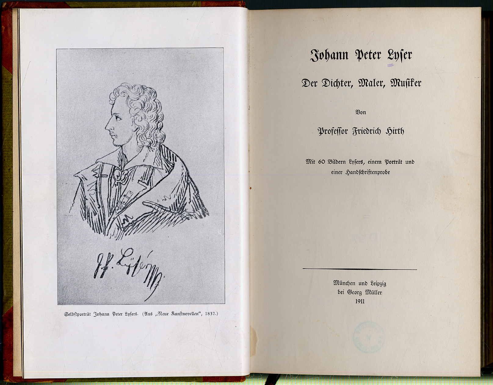 Hirth, Friedrich Eugen: Johann Peter Lyser. Der Dichter, Maler, Musiker. München [u.a.], Georg Müller, 1911. Ca. 22,5 x 14,5 cm. XI S., (5) S., 588 S., (2) Seiten. Mit 60 Bildern Lysers, einem Porträt und einer Handschriftenprobe. Halblederband der Zeit mit Rückengoldprägung. Rücken und Einbandkanten bestoßen. Mit 2 Exlibris und Besitzstempel. Erste Ausgabe. Mit einem Verzeichnis der Werke Lysers.