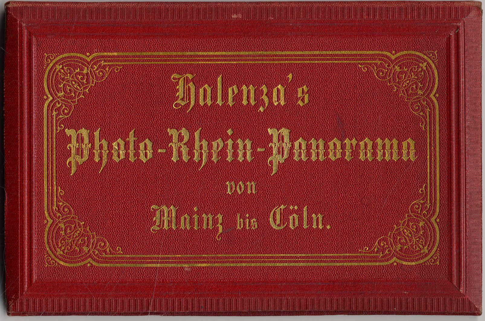 Halenza’s Photo-Rhein-Panorama von Mainz bis Cöln (Deckeltitel). Leporello. Mainz, Jos. Halenza, um 1890. Querformat, ca. 15 x 9,5 cm. Rheinpanorama mit 15 photolithographischen Elementen, auf Leinen aufgezogen. Roter relief- und goldgeprägter Orig.-Leinenband. Photolithographischer Nachdruck der Ausgabe ca. 1868. Zeigt den Rhein mit zahlreichen kleinen Ortsansichten am Rand. Sehr gutes Exemplar. Leporello, ca. 14 x 136 cm.
