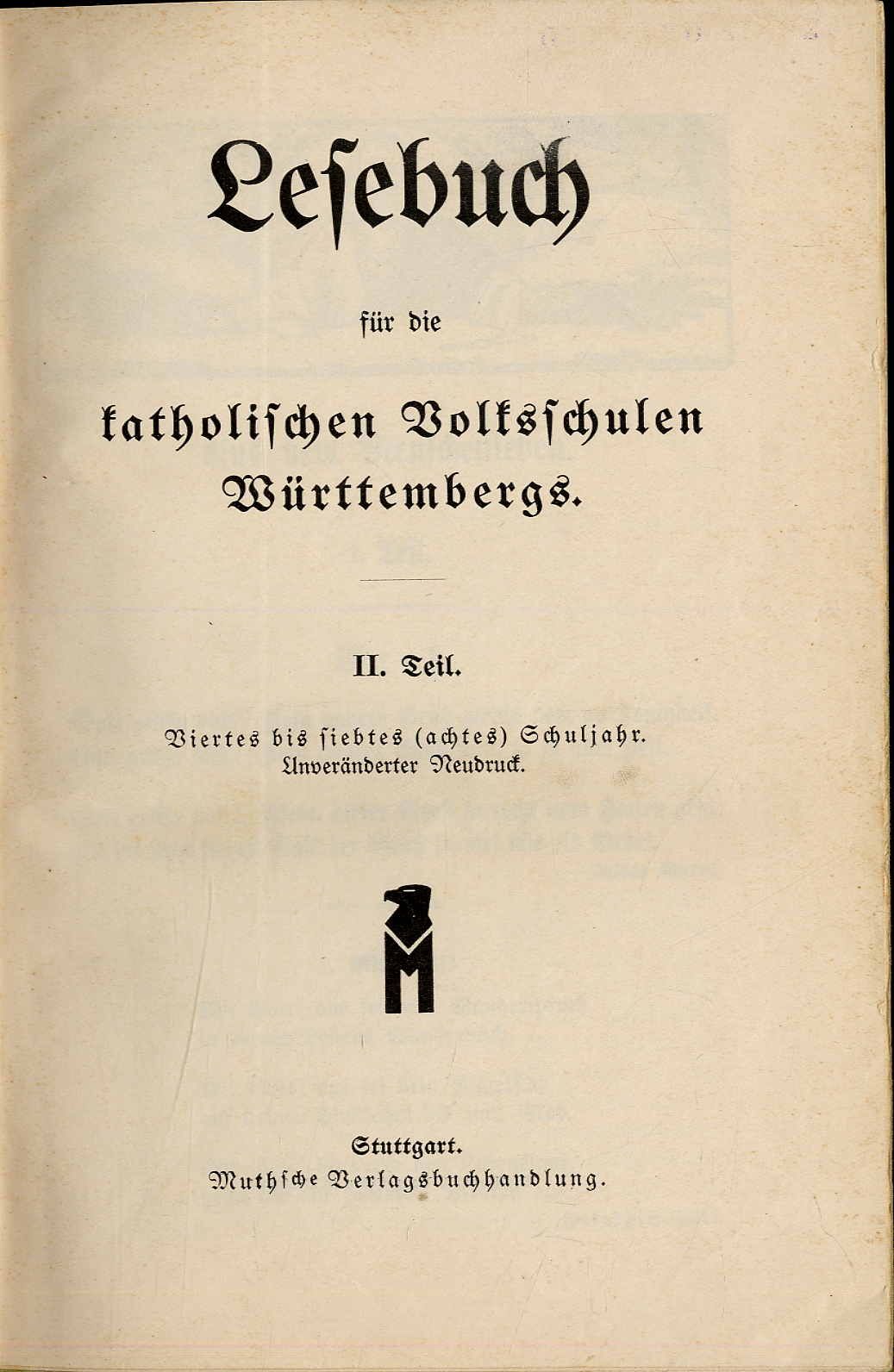 Lesebuch für die katholischen Volksschulen Württembergs. II. Teil. Viertes bis siebtes (achtes) Schuljahr. Unveränderter Neudruck. Stuttgart, Muthsche Verlagsbuchhandlung, ca. 1924. Ca. 22,5 x 15,5 cm. 624 Seiten. Mit einigen Illustrationen. Halbleinenband der Zeit. Seiten vereinzelt leicht stockfleckig, gutes Exemplar. Enthält 434 Gedichte und Texte.