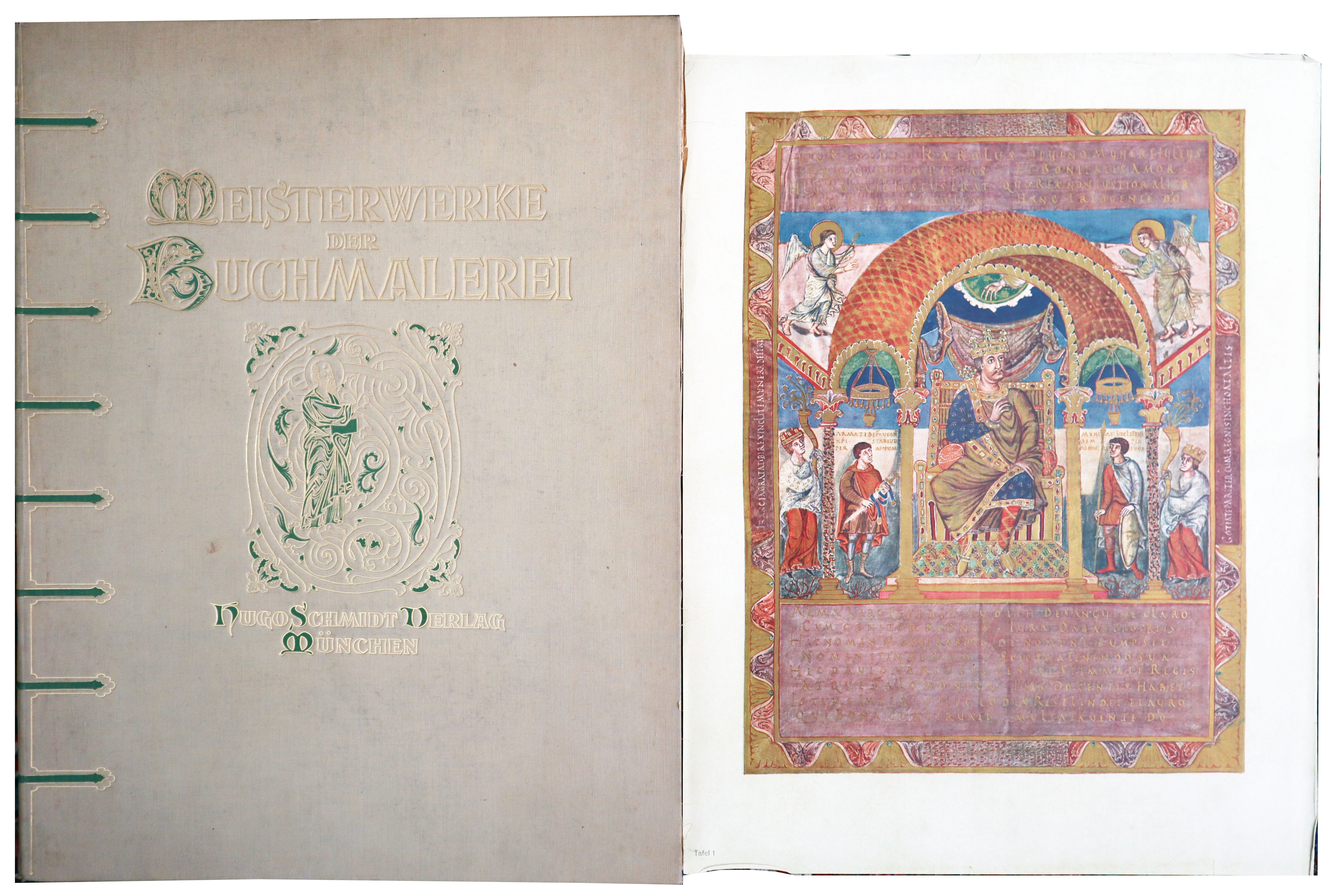Leidinger, Georg (Hrsg.): Meisterwerke der Buchmalerei. Aus Handschriften der Bayerischen Staatsbibliothek München. Einmalige Ausgabe in 1000 numerierten Exemplaren. München, Hugo Schmidt, 1920. Ca. 52 x 40 cm. 32 S., (2) Seiten Textheft; 50 ganzseitige farbige Abbildungen. Original-Leinenmappe mit reicher Grün- und Goldprägung. Exemplar 343/1000. Mappe Rücken bestoßen, Leinen an der Seite mit Einrissen. Tafeln teils leicht angerändert (nur im unbedruckten Bereich). Dekorativer Einband.