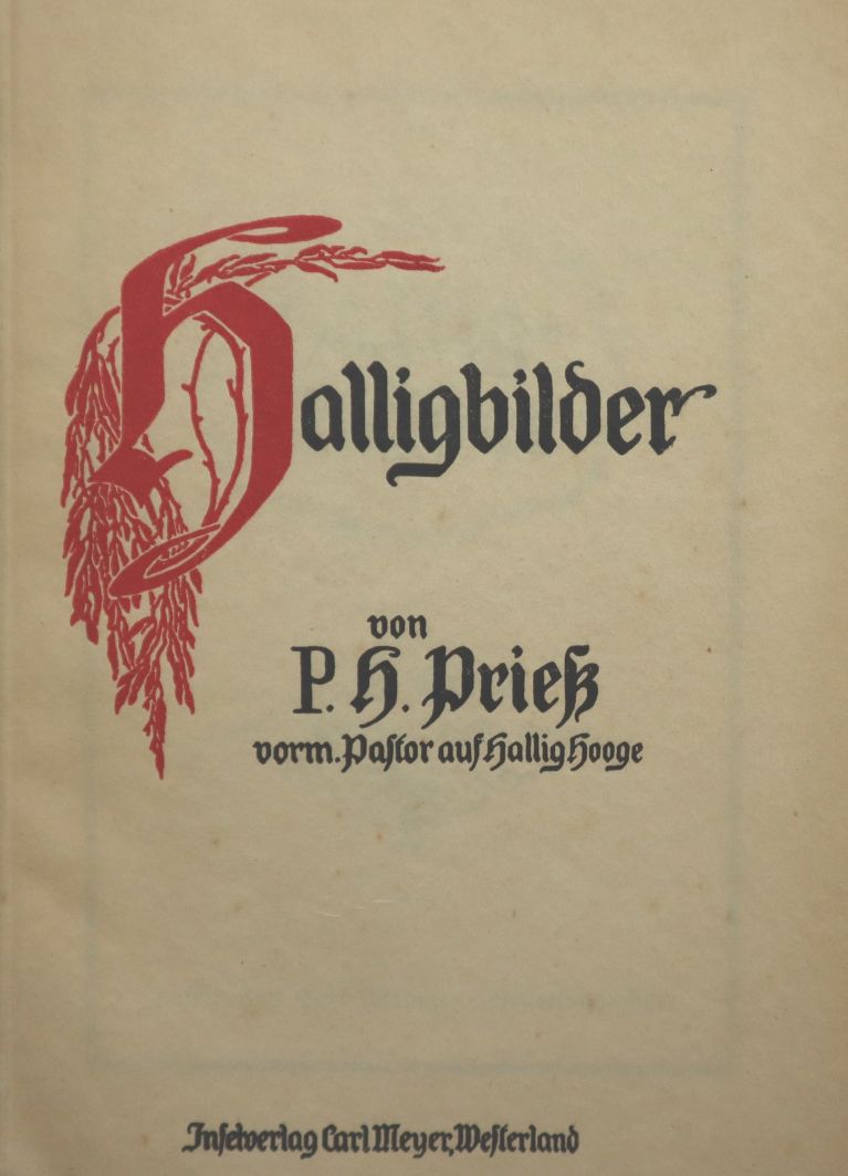 Prieß, Hans Hinrich: Hallig-Bilder. Westerland-Sylt, Carl Meyer, [1928]. Ca. 18 x 13 cm. 112 Seiten. Mit Illustrationen. Orig.-Broschur. Rücken und Einbandkanten etwas bestoßen, sonst gutes Exemplar. Aus dem Inhalt u.a.: Ein Altjahrs-.Abend auf der Hallig bei Sturmflut 1878; Sommermorgen auf der Hallig; Altfriesische Hochzeitsbräuche auf der Hallig; Ein Ausflug nach der Vogel-Hallig Norderoog.