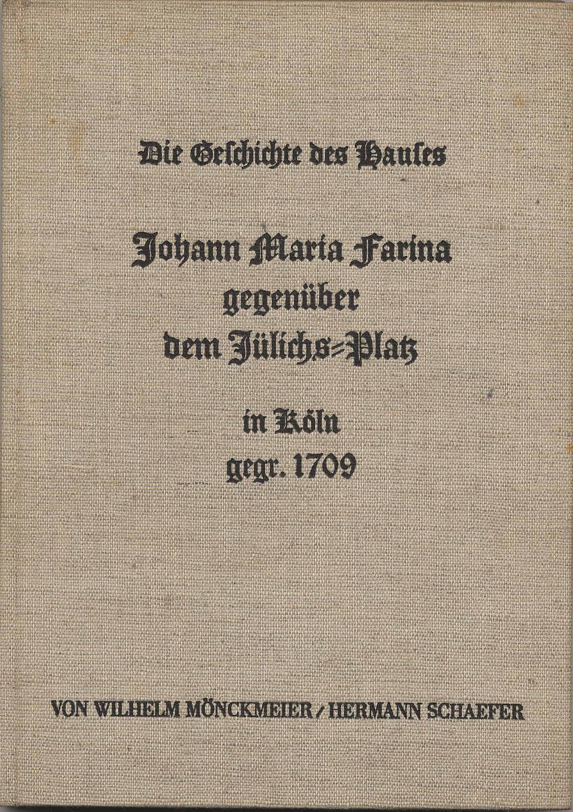 Mönckmeier, Wilhelm: Die Geschichte des Hauses Johann Maria Farina gegenüber dem Jülichs-Platz in Köln. Gegründet 1709. Eine wirtschafts- und handelsgeschichtliche Studie. Überarbeitt von Hermann Schaefer. Berlin, Kurt Vowinckel, 1934. Ca. 24,5 x 17,5 cm. X’V S., 200 Seiten. Mit einem Porträt, Faksimiles auf Tafeln, Stammbaum. Grauer Orig.-Leinenband. Aus der Reihe: Schriften des Rheinisch-Westfälischen Wirtschaftsarchivs, Band 7. Gutes Exemplar. Johann Maria Farina (1685-1766), Erfinder des „Eau de Cologne“.