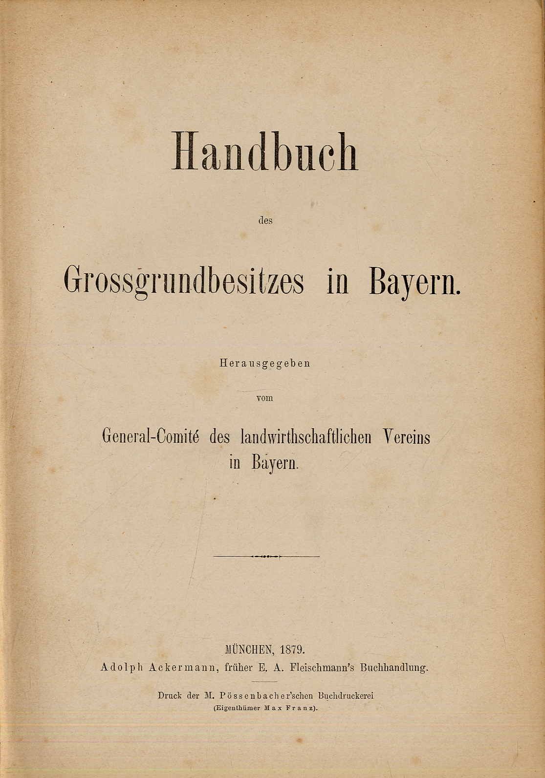 General-Comité des landwirthschaftlichen Vereins in Bayern (Hrsg.): Handbuch des Grossgrundbesitzes in Bayern. München, Adolph Ackermann, 1879. Ca. 25,5 x 18 cm. VIII S., 433 Seiten, mit einer mehrfach gefalteten Karte „Königreich Bayern“. Brauner Leinenband der Zeit mit reicher Rückengoldprägung. Erste Auflage. Rücken teils aufgeplatzt, Buchblock dadurch etwas gelockert. Seiten papierbedingt etwas gebräunt, teilsweise leicht stockfleckig. „Wir wollten … nicht blos eine trockene Zusammenfassung der einzelnen Besitzungen geben, sondern durch Beifügung statistischer Merkmale und kurzer historischer Nachrichten das Ganze zu einem lebenden Bilde gestalten, aus dem man sich eine ziemlich annähernde Vorstellung von den einzelnen Gütern machen könne.“ (Einleitung). Mit ausführlichen Beschreibungen der Güter, u.a.: Maximilian v. Gravenreuth in Affing; Krafft v. Crailsheim in Amerang; Sigmund Höck in Birkeneck; August v. Wendland in Bernried; Heinrich Ranke in Laufzorn; Edmund v. Bouteville in Mering; Robert Schnider in Schwabhof; Sepp in Wessobrunn; Joseph v. Deym in Arnstorf; Carl v. Arco-Valley in Oberköllnbach; Georg Schäfer in Oberpiebing; Eduard Vollmer Geilweiler-Hof (Siebeldingen); Jean Janson, Harxheim im Zellerthal; Arthur Bohnenberger in Petersau; Eugen v. Bassus, Sandersdorf; Maximilian v. Gise in Teublitz; Seefried v. Buttenheim in Adlitz und Buttenheim; Max in Bayern, Schloss Banz; Alexander v. Württemberg, Fantasi (Bayreuth); Adam Lang, Fattigau; Woldemar v. Waldenfels, Nentschau; v. Guttenberg, Weisendorf; Hermann Beckh, Rathsberg; Lothar v. Faber, Unterweihersbuch; Weinbergsgut Mainberg und Oekonomiegut Kaltenhof; v. Stein Rittergut Rossrieth; Hermann John, Weiberhof (Aschaffenburg); Albert v. Rechberg u. Rothenlöwen, Ost-Ettringen mit Piesternhof; Törring-Jettenbach, Hauptgut Pörnbach; Georg Benedikt v. Poschinger, Oberfrauenau u.v.a. Sehr seltene und interessante Zusammenstellung.