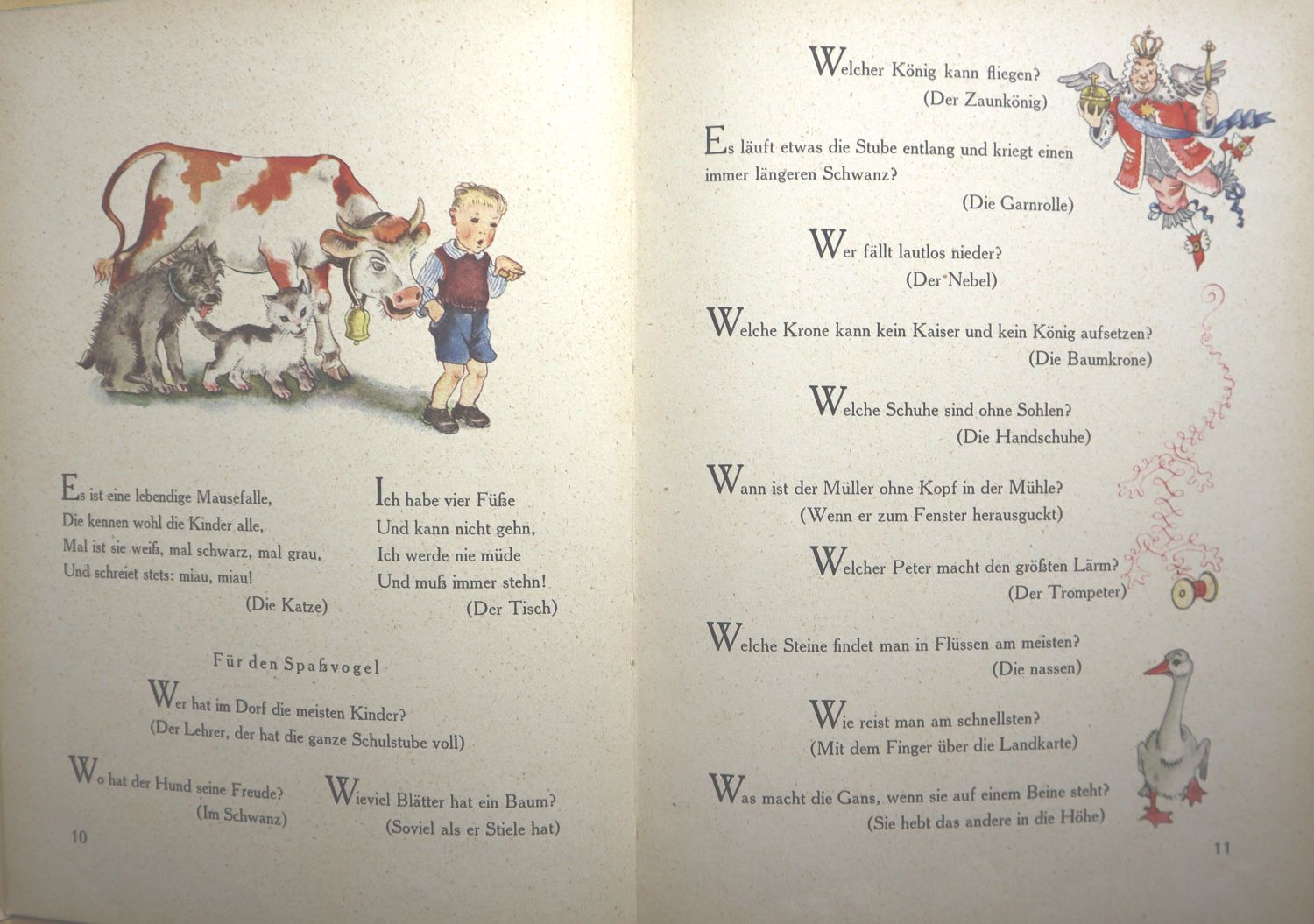 Walendy, Paula: Die Rätselstiege. Ein lustiges Rätsel-Bilderbuch fürs Kind. Gesammelt und herausgegeben. 24.-33. Tsd. Stuttgart, K. Thienemann, 1949. Ca. 22,5 x 16 cm. 80 S. Mit vielen farbigen Zeichnungen von Marianne Schneegans. Farbig illustr. Orig.-Halbleinenband. LKJ III, 763/764. Paula Walendy produzierte u.a. Märchen- und Singspiele für den Rundfunk und arbeitete an den ersten Sendungen des Kinderfernsehens beim WDR in Köln mit. Ihre Bücher beschäftigen sich mit Themen der „Kindervolkspoesie“ – Rätsel, Zaubersprüche, Spiele, Gedichte, Kinderreime, Abzählverse. Einbandkanten leicht bestoßen, gutes Exemplar.