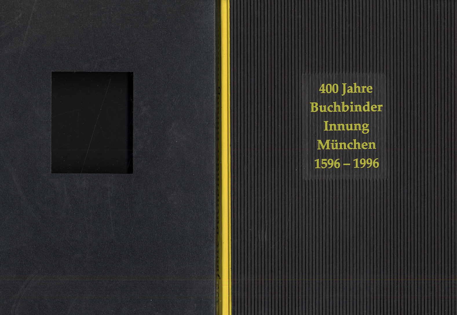 Buchbinder-Innung München-Oberbayern (Hrsg.): 400 Jahre Buchbinder-Innung München 1596-1996. 1. Auflage. München, Peter Glas, 1996. Ca. 32 x 24 cm. 178 S., 51 S., (20) Seiten. Mit Textillustrationen und 92 teils farbigen Abbildungen auf Tafeln. Gelb-Schwarzer Originalleinenband mit schwarzem Original-Pappschuber. Sehr gutes Exemplar.