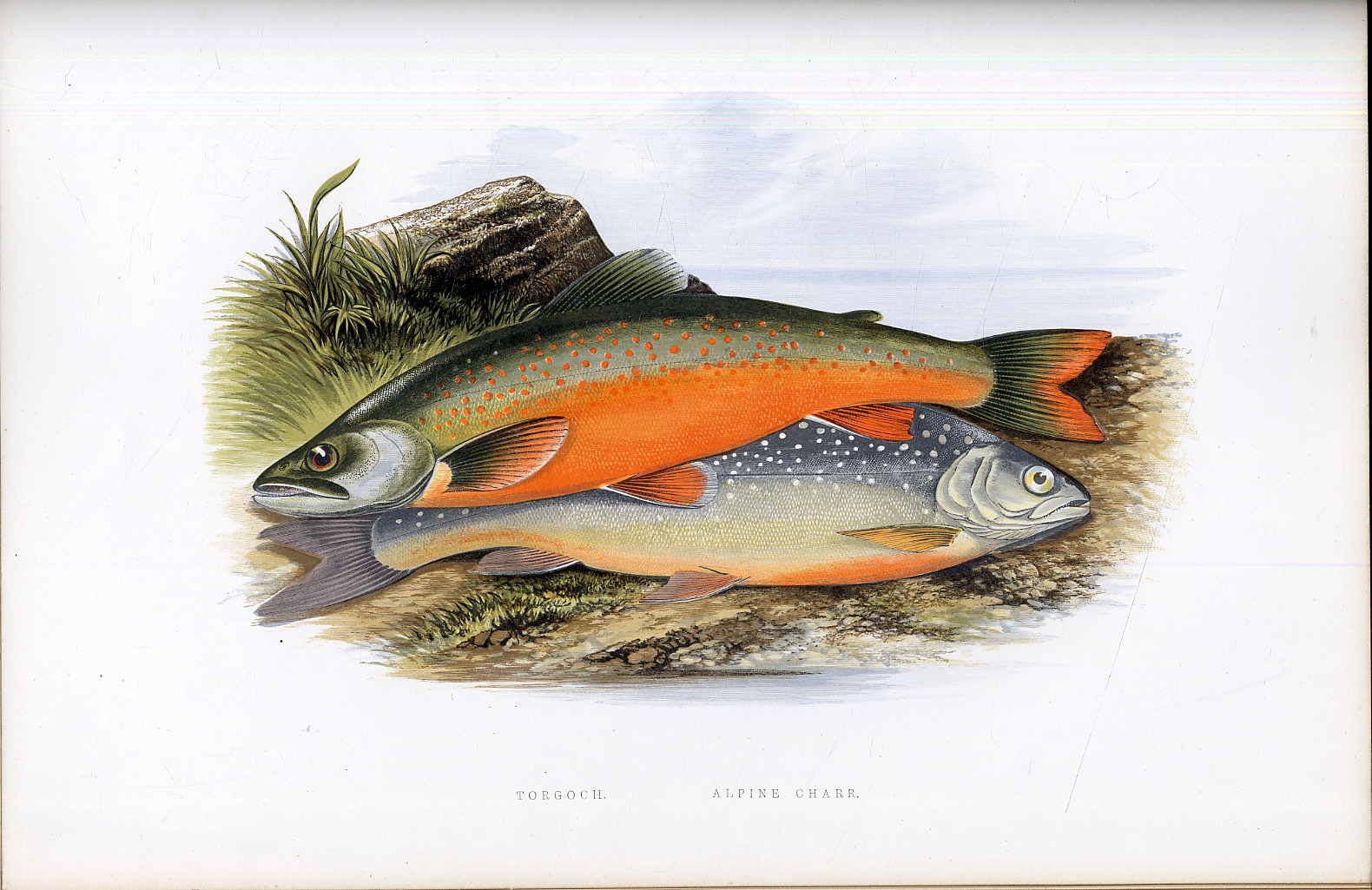 Houghton, W[illiam]: British fresh-water fishes. London, William Mackenzie, (1879). Ca. 37,5 x 28,5 cm. XXVI S., 204 Seiten, mit Textvignetten und Textillustratioen sowie 41 ganzseitigen Farbholzschnitten (illustrated with a coloured figure of each species draws from nature by A.F. Lydon and numerous engravings). Grüner Ganzledereinband mit reicher Deckelvergoldung und farbigem Rückenschild. Mit Goldschnitt. Erste Ausgabe. „Die Werke von … William Houghton mit ihren Farbholzschnitten nach Bildern seines Hauptmitarbeiters Frank Lydon zeugen vom hohen Rang seines Könnens.“ (Nissen S. 33 u. S. 73). Text in englisch. Rücken fachmännisch und schön erneuert. Einband leicht berieben. Mit prächtigen Farbtafeln illustriertes, dekorativ gebundenes Werk.