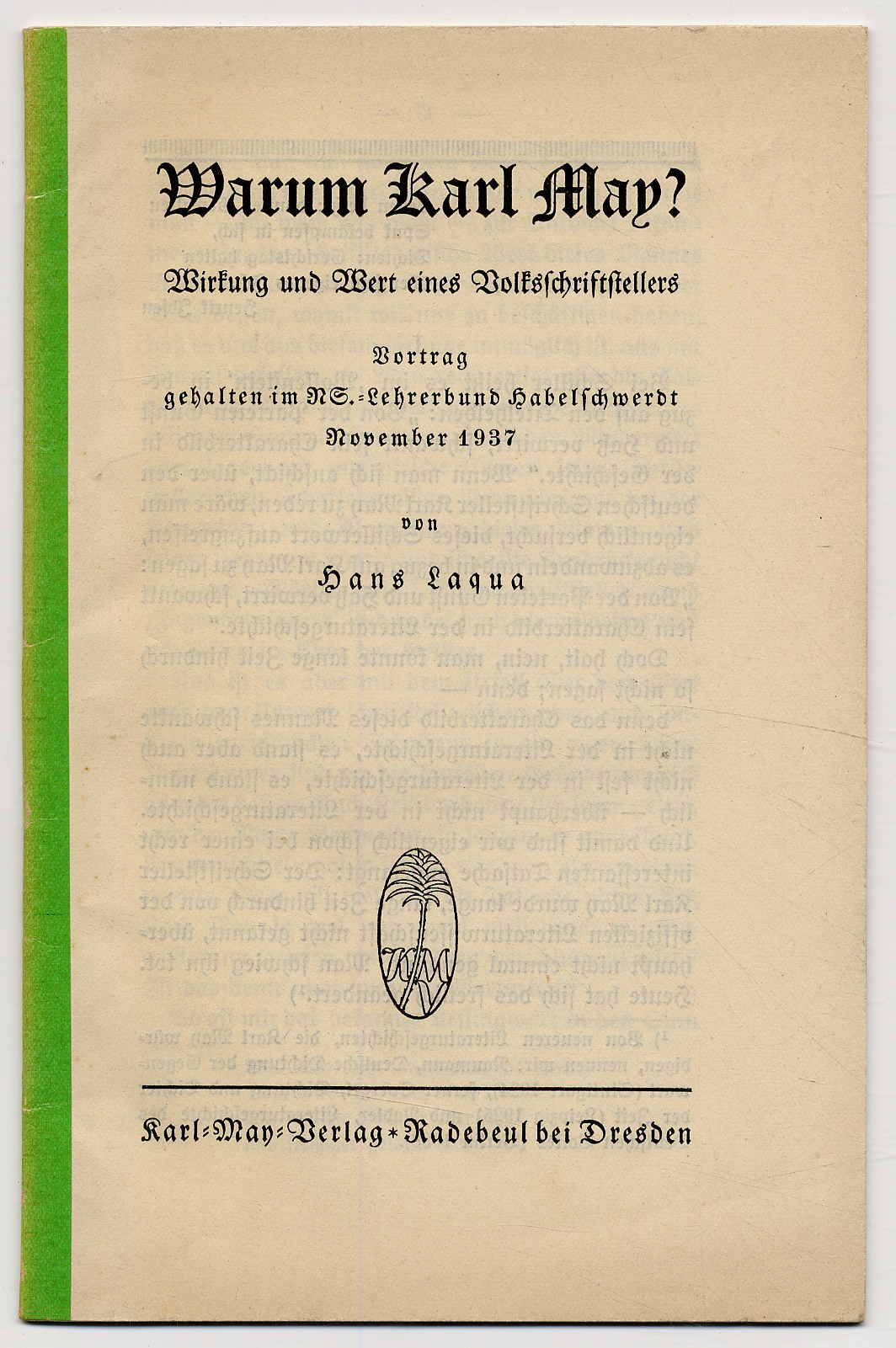 Laqua, Hans: Warum Karl May? Wirkung und Wert eines Volksschriftstellers. 1939. Ca. 19 x 12,5 cm. 32 Seiten. Original-Rückenbroschur. Hermesmeier/Schmatz SL21.2. Vortrag, gehalten November 1937.