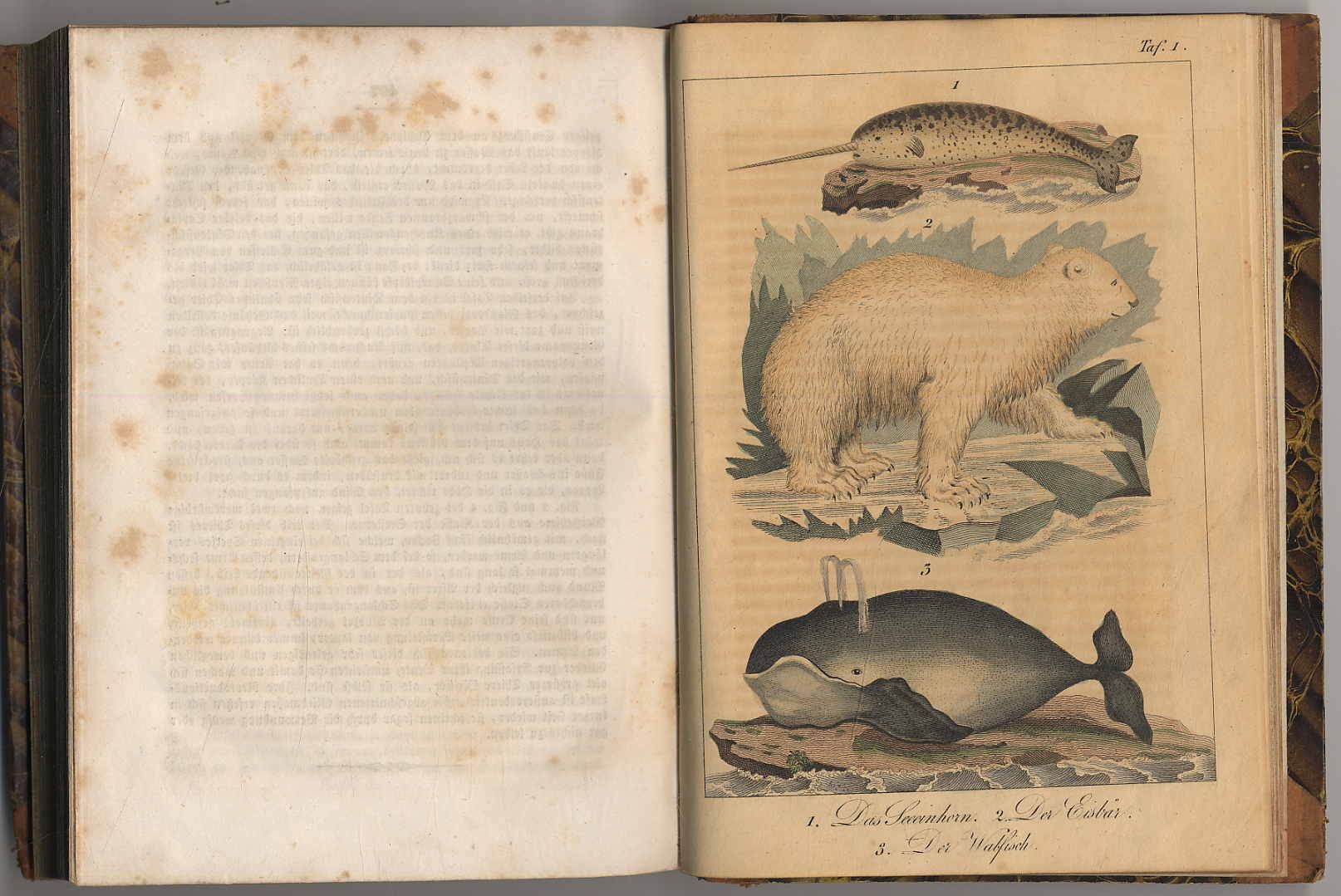 Zimmermann, W. F. A. (d.i. Carl Gottfried Wilhelm Vollmer) (Hrsg.): Das Meer, seine Bewohner und seine Wunder. Seitenstück zu K. F. V. Hoffmann’s Erde und ihre Bewohner. 2 Bände. Stuttgart, Julius Weise, 1837. Ca. 19,5 x 14 cm. 407 Seiten, mit Stahlstich-Fronispiz, gestochenem Titelblatt und 3 lithographierten Tafeln, 380 Seiten, mit 10 lithographierten Tafeln (davon 8 farbigen); Halblederbände der Zeit mjit Rückengoldprägung. Rücken und Kanten etwas bestoßen. Vorsätze an den Ecken leimschattig. Seiten teils gebräunt bzw. stockfleckig, die nicht colorierten Tafeln in Band 1 gebräunt. Hübsch colorierte Tafeln.