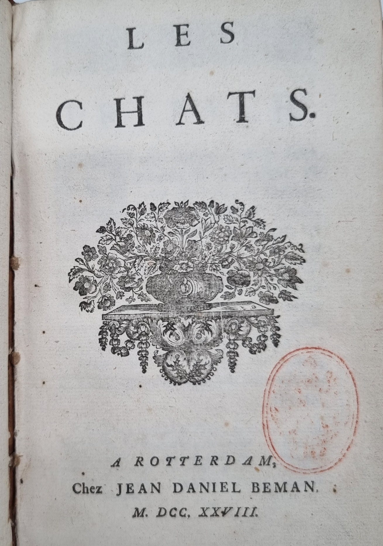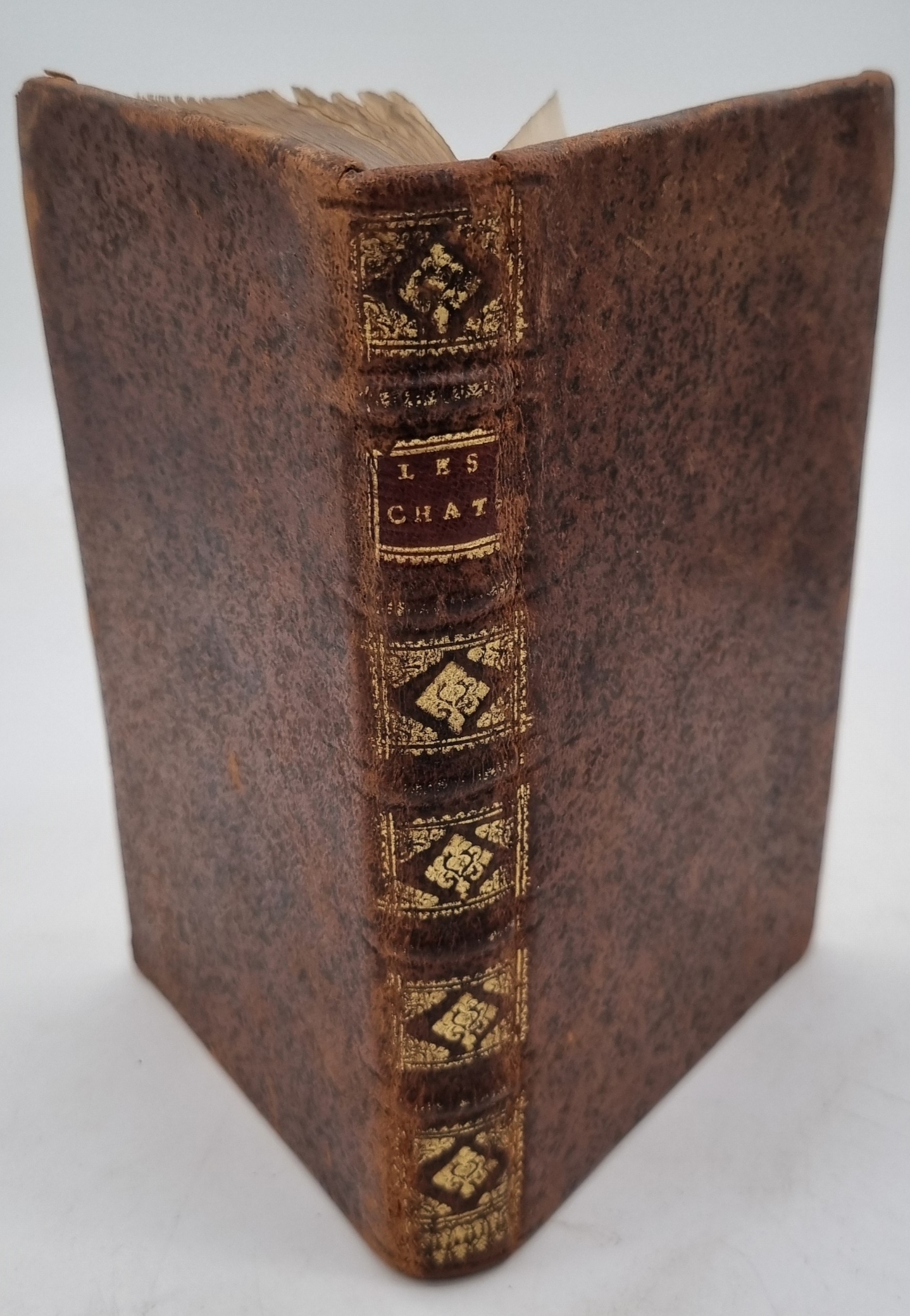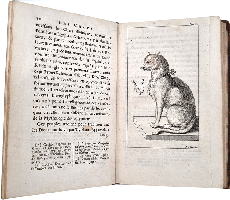 [Moncrif, Francois Augustin de]: Les chats. Rotterdam, Jean Daniel Beman, 1728. Ca. 19 x 12 cm. VIII S., 204 S., (12) Seiten. Mit Holzschnitt-Titelvignette und 10 (teils gefalteten) Kupferstichtafeln. Ledereinband der Zeit mit Rückengoldprägung. Mit Exlibris. Schwache Reste eines roten Besitzstempels auf Titelblatt. Minimal stockfleckig. In 11 Briefen an Madame de B*** wird auf unterhaltsame Weise die Geschichte der Katze erzählt – das erste Buch (erstmals 1727 in Paris erschienen), das sich ganz und gar der Katze widmet. In französisch.