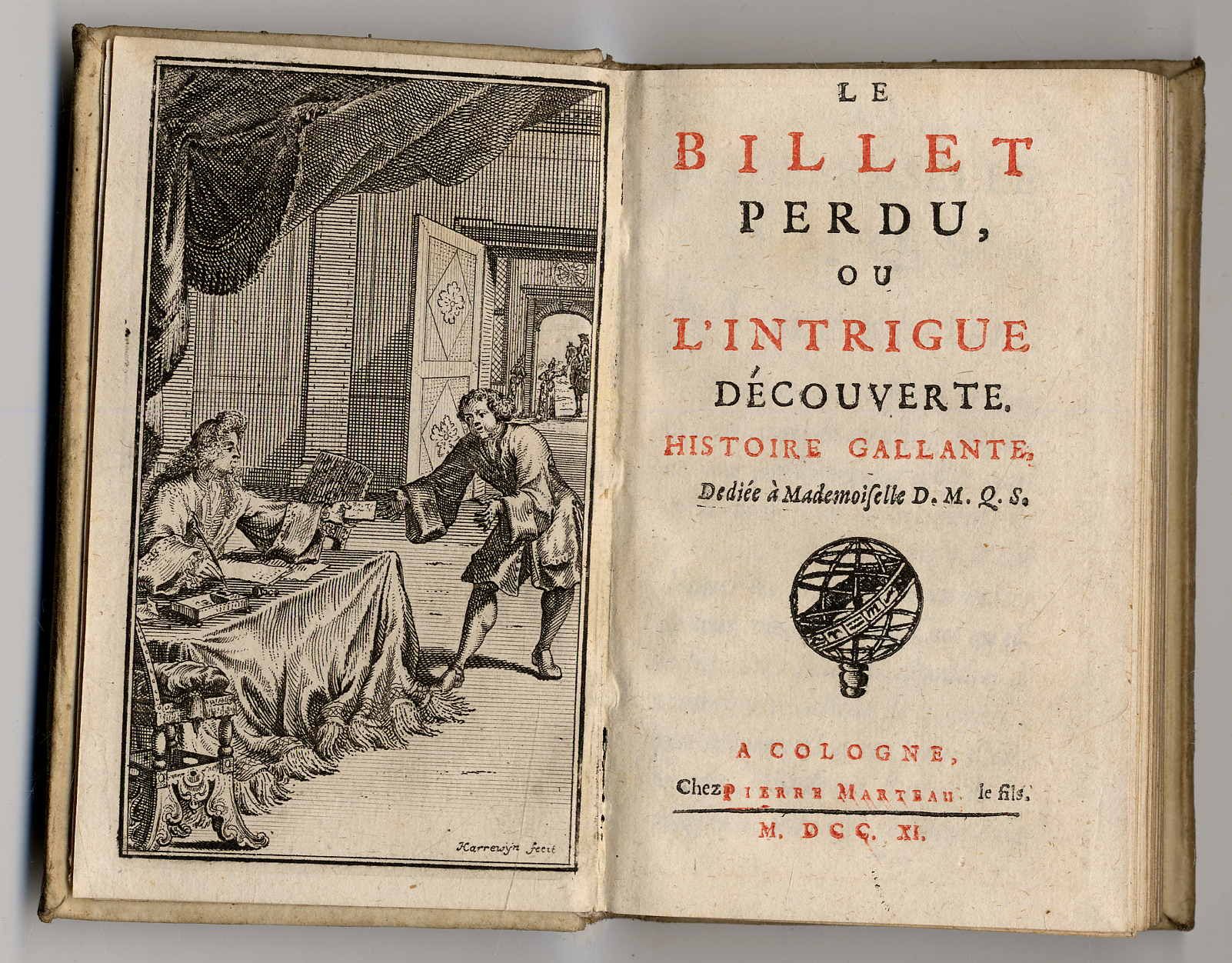 Le Billet perdu, ou l’intrigue découverte. Histoire gallante. Dediée à Mademoiselle D.M.Q.S. „Cologne, Pierre Marteau le fils“ (d.i.?) 1711. Ca. 13 x 9 cm. (10) S., 206 Seiten. Mit Frontispiz von Harrewyn. Pergamentband der Zeit. Erste Ausgabe. Weller, Druckorte II,76 (vermutet einen Druckort in den Niederlanden). Einband etwas angestaubt, Vorsätze leicht gelockert. Text in französisch.