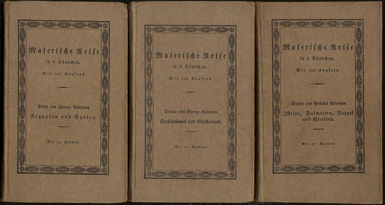 Malerische Reise in Aegypten und Syrien über Constantinopel nach Griechenland, Dalmatien, Illyrien, Neapel und Sicilien. 6 (in 3) Bänden. Leipzig, Gerhard Fleischer d. Jüng., 1820. Ca. 17 x 10,5 cm. Mit 103 (einigen doppelblattgroßen) Kupferstichtafeln nach L. F. Cassas u.a. sowie einer Tabelle. Original-Pappbände. Der Text wurde aus verschiedenen Reiseberichten zusammengestellt, im Vorwort der einzelnen Bände genaue Quellenangaben. Gezeigt werden Städte, Landschaften, und Bauwerke, meist mit lebhafter Staffage. Band 1: Malerische Reise in Aegypten; Band 2: Malerische Reise in Syrien; Band 3: Die Malerische Reise in Constantinopel; 4. Band: Die malerische Reise in Griechenland; 5. Band: Malerische Reise in Istrien und Dalmatien; 6. Band: Malerische Reise in Neapel und Sicilien. Mit einem Nachtrage über Aegypten. Teils lechter Abklatsch der Kupfer auf gegenüberliegender Seite, jedoch sehr gutes Exemplar in den Original-Pappeinbänden.