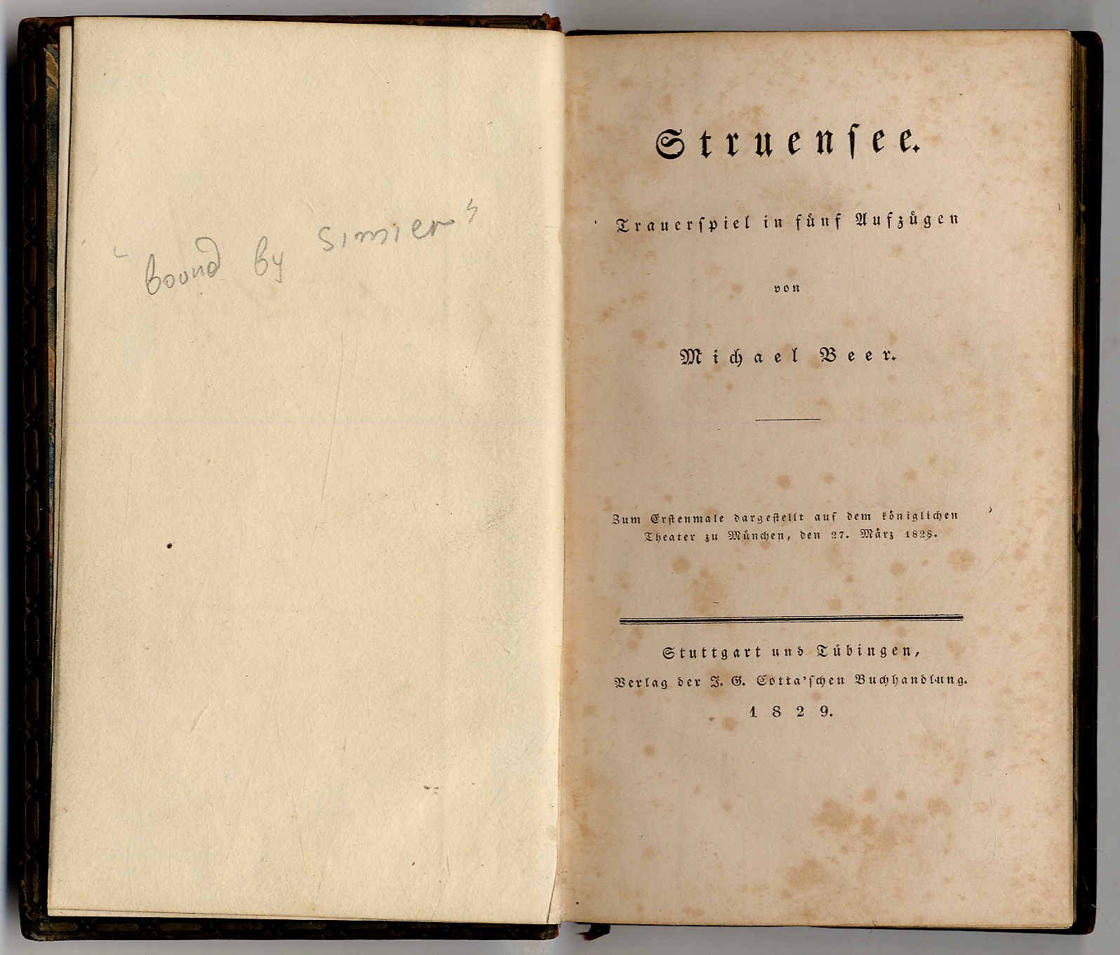 Beer, Michael: Struensee. Trauerspiel in fünf Aufzügen. Stuttgart und Tübiingen, J. G. Cotta’sche Buchhandlung, 1829. Ca. 18,5 x 11 cm. (8) S., 230 Seiten. Blindgeprägter Ledereinband der Zeit mit Deckelfileten und Rückenvergoldung. Goedeke VIII, 570, 9. ADB II, 250. Alter Namenszug auf Vorsatz. Rücken und Kanten bestoßen. Seiten teils stockfleckig. Ohne das Erratablatt am Schluss. Erste Ausgabe seines Trauerspiels, dem letzten Werk des mit 32 Jahren verstorbenen Berliner Dramatikers Michael Beer (1800-1833). Die Bühnenmusik zur Uraufführung am 27. März 1828 in München komponierte sein Bruder Giacomo Meyerbeer. Beers Drama „Struensee ist auf den tiefen Gegensatz zwischen fortschreitender Reform und widerstrebender junkerhafter Selbstsucht gebaut; aber der dramatische Aufbau ist unsicher, die Handlung wirr und in Episoden verzettelt. Michael Beer war von edler Gesinnung und feiner Bildung, aber ohne Tiefe und Ursprünglichkeit“ (ADB). „Bekannt wurde B. durch sein Trauerspiel „Struensee“ (1829, mit Musik seines Bruders), das unter Förderung König Ludwigs I. aufgeführt und auch von Goethe geschätzt wurde.“ (H. Maiworm, NDB 1, 737).