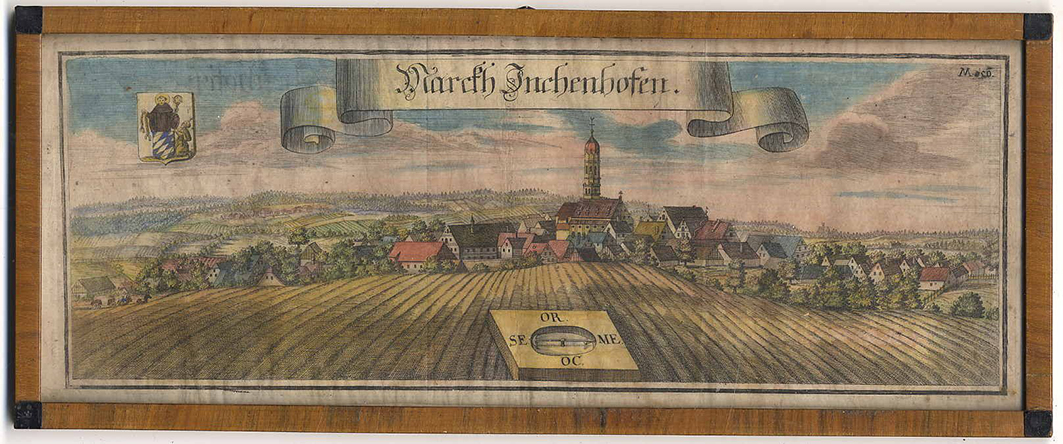 Inchenhofen – Marckh Inchenhofen. Colorierter Kupferstich von Michael Wening. Um 1750. Querformat, ca. 13 x 35 cm. Gerahmt, unter Glas. Plattennummer M50. Sehr dekorativer Kupferstich mit alter Koloratur. Gesamtansicht.