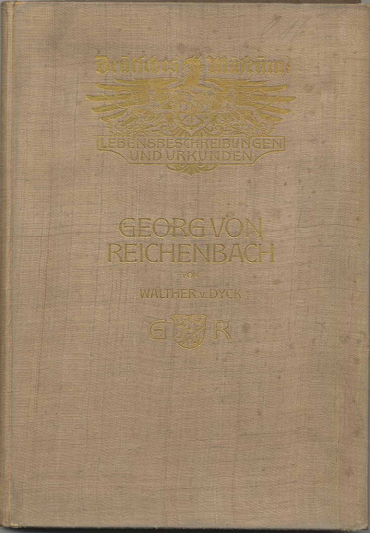 Dyck, Walther von: Georg von Reichenbach. Beigefügt: W. v. Dyck: Georg v. Reichenbach. Vortrag gehalten in der 5. Jahresversammlung des Deutschen Museums. München, Selbstverlag des Deutschen Museums, 1912. 37526 140 Seiten. Mit Titelbild und 8 Tafeln. Orig.-Leinenband. Aus der Reihe: Deutsches Museum, Lebensbeschreibungen und Urkunden. Rücken und Kanten etwas bestoßen. Einband angestaubt und teils fleckig. Unaufgeschnittenes Exemplar. Der Vortrag „Antrag zur Errichtung eines Denkmals im Ehrensaal des Deutschen Museums im Namen des Vorstandsrates vorgelegt in der Ausschußsitzung am 1. Oktober 1908“ als „Probedruck für die Besprechung im Vorstandsrat angefertigt“.