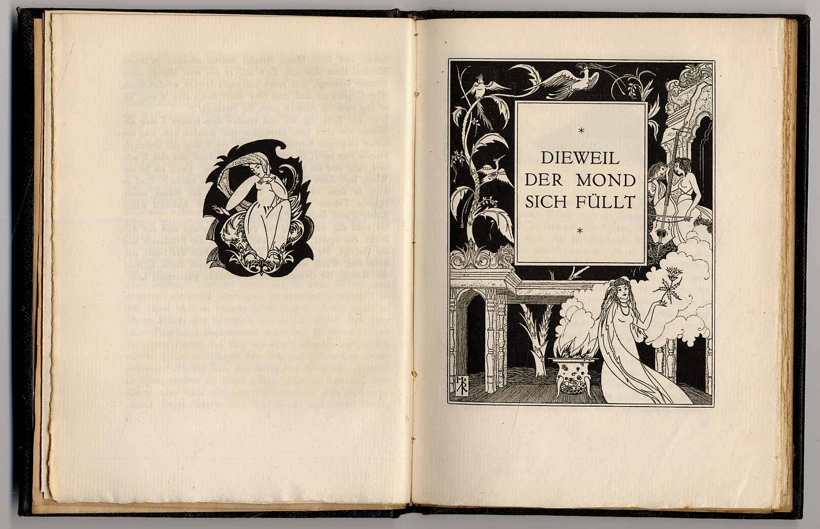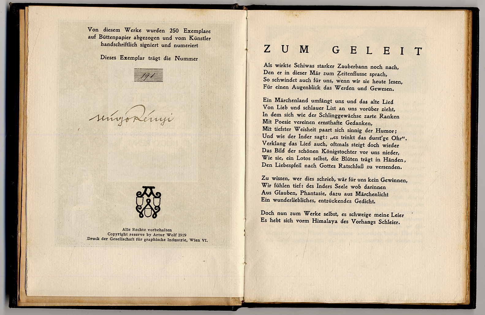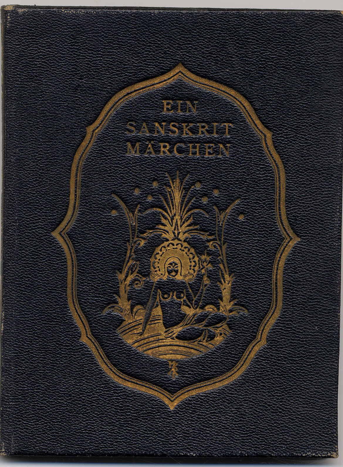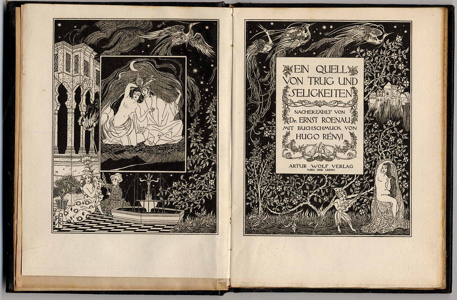 Roenau, Ernst: Ein Quell von Trug und Seligkeiten. (Deckeltitel: Ein Sanskrit Märchen). Wien u. Leipzig, Artur Wolf Verlag, 1919. Ca. 19,5 x 14,5 cm. 79 Seiten. Mit illustriertem Doppeltitel und Buchschmuck von Hugo Rényi. Original-Ganzlederband mit Goldprägung. Mit Kopfgoldschnitt. Exemplar 191/250 der Vorzugsausgabe in Ganzleder und auf Büttenpapier, vom Künstler Hugo Rényi eigenhändig signiert. Sanskritmärchen, von Roenau nacherzählt. Einband minimal berieben. Geschenkwidmung auf Vorsatz.