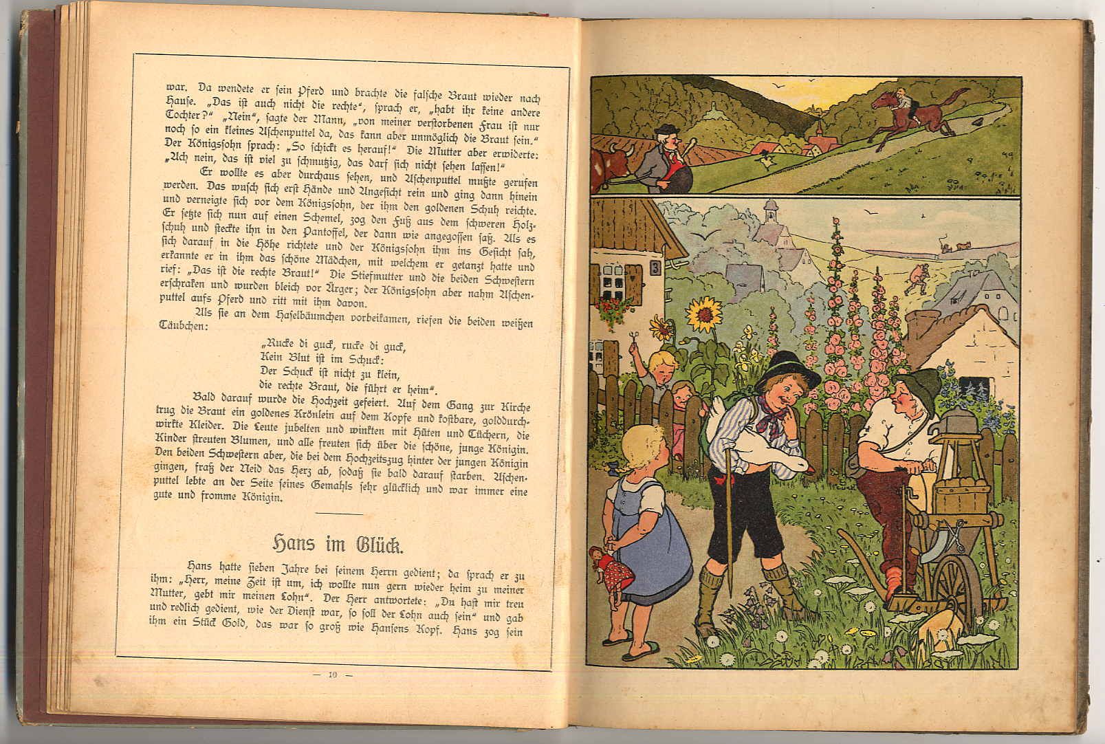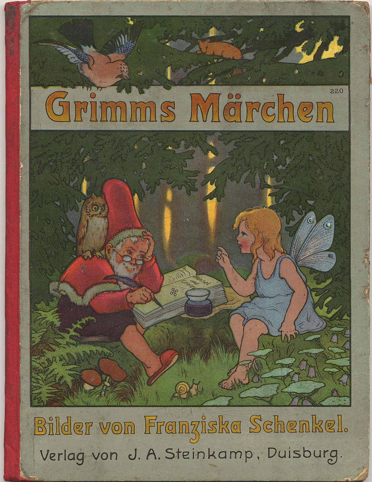 Grimm, Brüder: Kinder- und Hausmärchen. Duisburg, J. A. Steinkamp, [1913]. Ca. 27 x 20 cm. 34 Seiten. Mit 8 fanzseitigen farbigen Illustrationen von Franziska Schenkel. Farbig illustr. Orig.-Halbleinenband. Ries 841.1. Einbandkanten etwas besteoßen. Seitenränder etwas fingerfleckig. Enthält die Märchen: Rotkäppchen, Aschenputtel, Hans im Glück, Dornröschen, Schneewittchen, Hänsel und Gretel, Rumpelstilzchen und der Froschkönig.