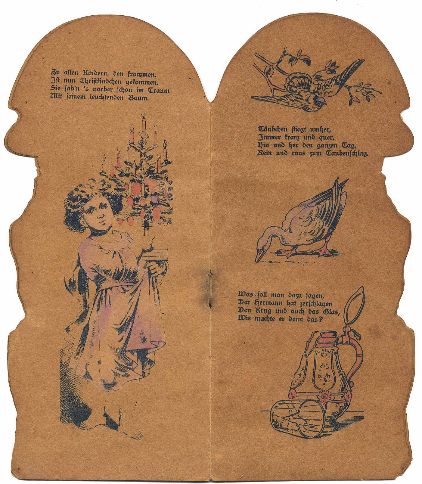 Umrissbilderbuch ohne Titel. Ohne Ort und ohne Verlag, um 1900. Ca. 22 x 9,5 cm. (12) Seiten. Mit colorierten Illustrationen. Farbig illustrierter, lithographierter Original-Karton (Umrissbilderbuch in Form eines Mädchens mit Sonnenschirm). Mit Reimen. Die Bilder zeigen Kinder beim Holzsammeln, vor der Wanduhr, den Weihnachtsmann, Christkind mit Christbaum, den Osterhasen, ein Kind auf einem Esel. etc. Hinterdeckel mit kleiner Fehlstelle. Durchgehend gebrunt. Auf dem Einband gedruckt „Nr. 1000“ und „L.&t. L.“.