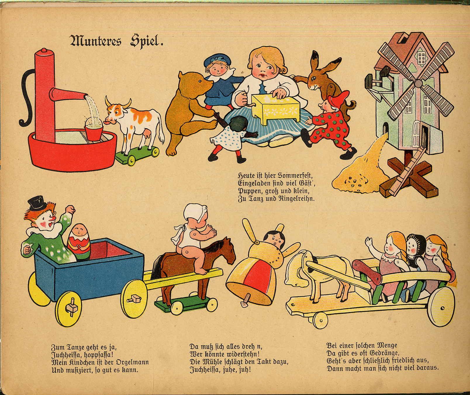 Steinkamp, Maria: Ihr Kinderlein kommet. Duisburg, J.A. Steinkamp, [1912]. Querformat, ca. 27 x 33 cm. (12) Seiten mit farbigen Illustrationen von Gertrud Pfeiffer-Kohrt. Farbig illustr. Orig.-Halbleinenband. Klotz 7064/1. Erste Auflage. Einbandkanten etwas bestoßen. Mit hübsch illustrierten Vorsätzen. Das Buch hat keinen religiösen Hintergrund. Die Bilder und Verse zu den Themen: Frühling: „Vogelmuter schützt die Brut, – Küchlein atmet Leben. – Kinder, pflegt die Gaben gut, – Die der Lenz gegeben.“; Die Sonne geht auf; Am Morgen; Krieg und Frieden; Munteres Spiel; Schlaf, Kindchen schlaf; Vom Samenkorn; Vom Jungen, der alles kaput macht: „Das Pferdchen hebt den dünnen Schwanz, – es möcht sein Leid wohl klagen. – Doch geht das nicht, der Nichtsnutz hat – Den Kopf ihm abgeschlagen“; Es kommt Besuch. Reich illustriert.