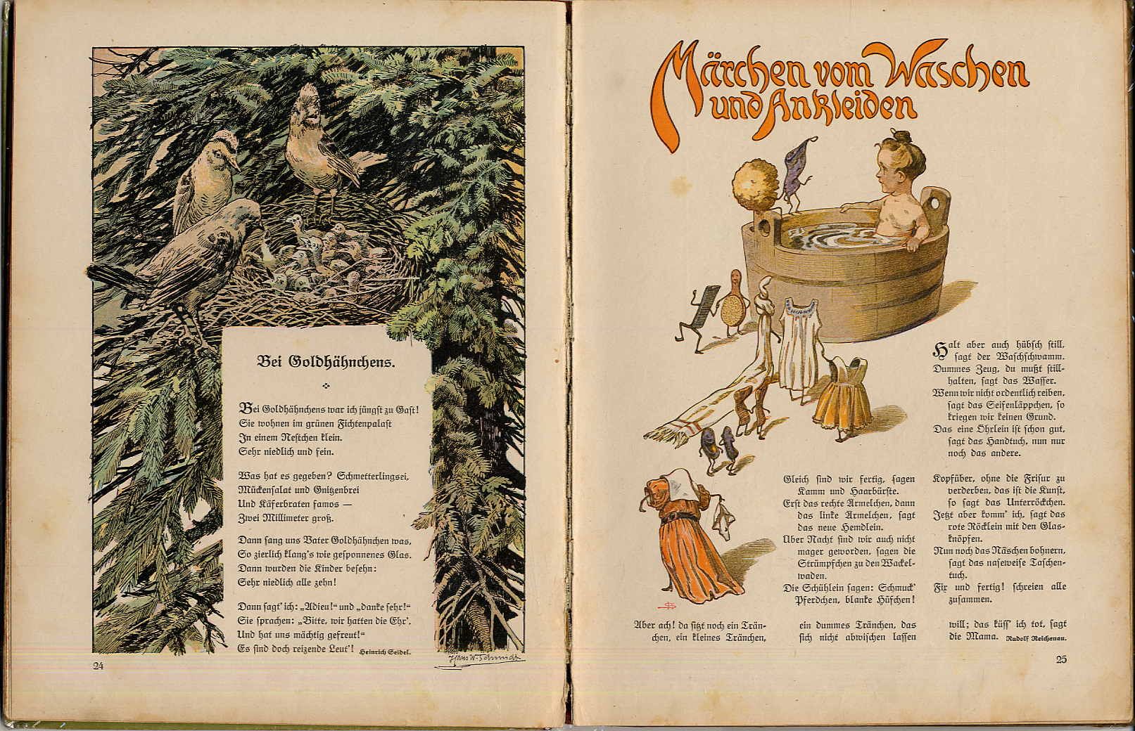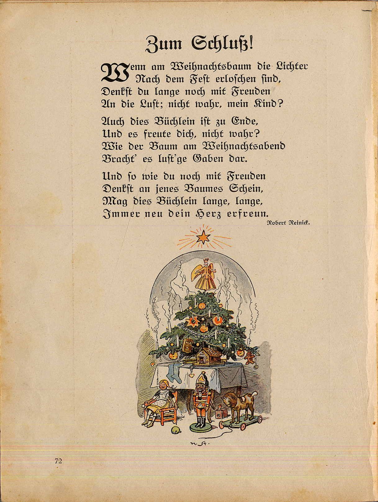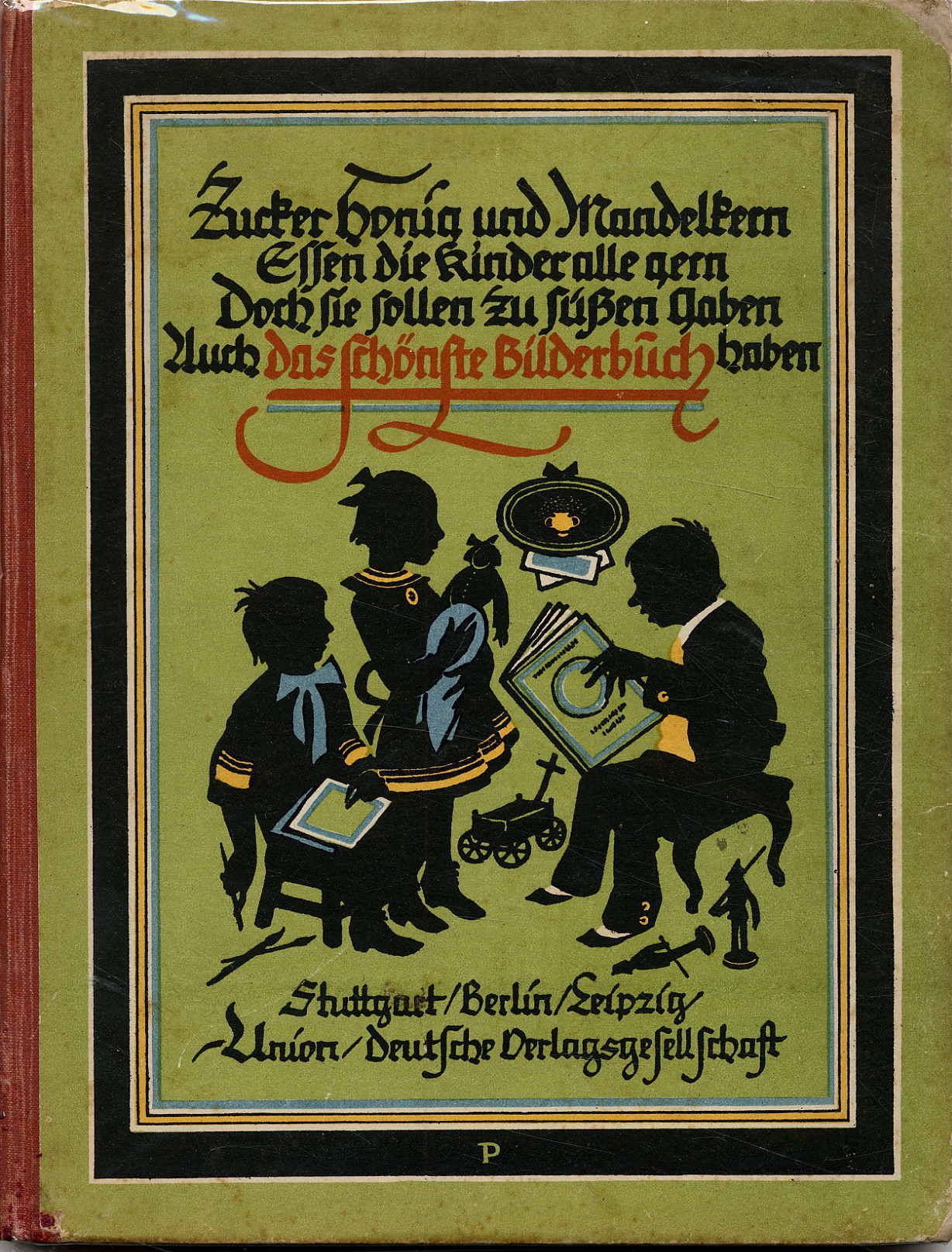 Das schönste Bilderbuch. Deckeltitel: Zucker Honig und Mandelkern Essen alle Kinder gern Doch sie sollen zu süßen Gaben Auch das schönste Bilderbuch haben. Stuttgart u.a., Union Deutsche Verlagsgesellschaft, [1919]. Ca. 27,5 x 21 cm. 72 Seiten. Mit farbigen, teils ganzseitigen Illustrationen u.a. von Joseph Correggio, Hermann Stockmann, Franz Müller-Münster, Aug. Roeseler, Hans Stubenrauch, Karl Mühlmeister, Paul Wendling, Otto Kubel, Franz Kopallik. Farbig illustr. Orig.-Halbleinenband, mit illustrierten Vorsätzen. Einbandkanten leicht bestoßen, vorderes fliegendes Vorsatzblatt fehlt. Seitenränder teils etwas fingerfleckig (Titelblatt etwas stärker). Mit Beiträgen u.a. von Fr. Güll, K. Enslin, Ed. Mörike, H. Seidel, F. J. Bertuch, W. Hey, J.W. Goethe, R. Reinick, P. Schanz. Kinderbuch mit Märchen, Versen und kleinen Geschichten.
