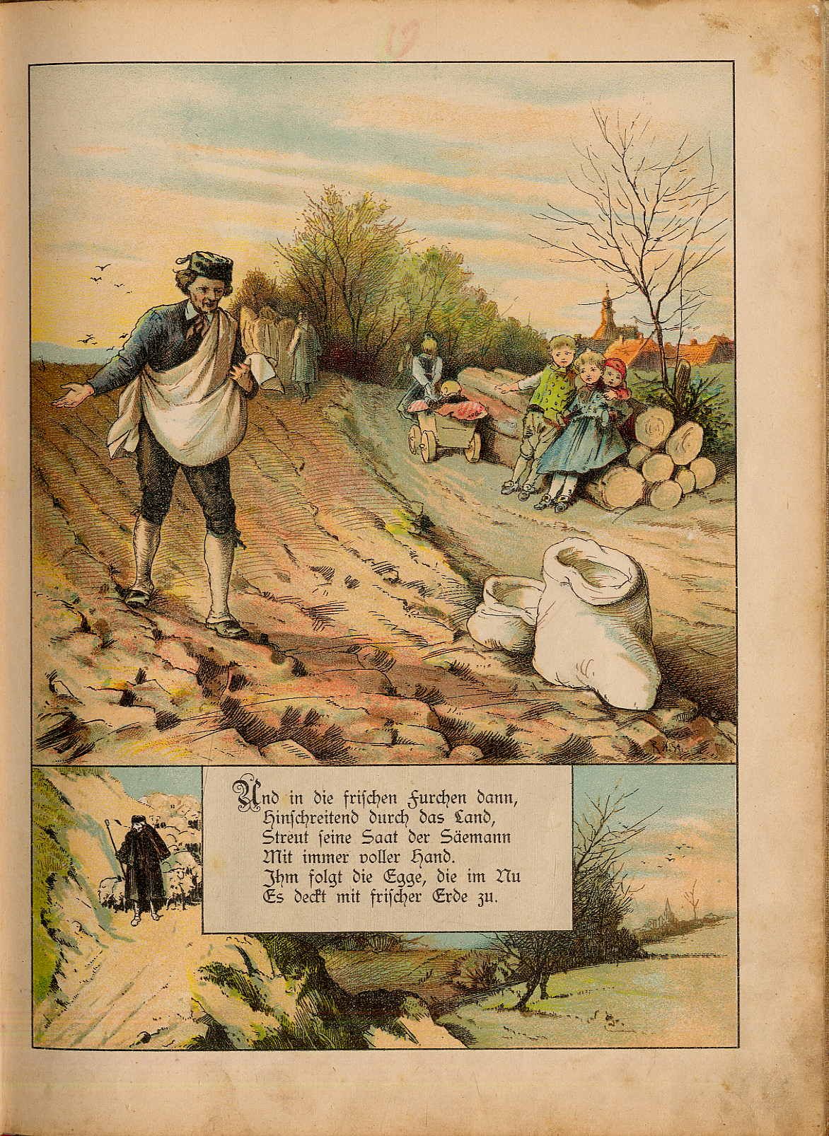 Steinkamp, A.: Woher kommt’s Brot? Bilder mit unterhaltendem Text fürs kleine Volk. Duisburg, J. A. Steinkamp, [1897]. Ca. 26,5 x 20,5 cm. (36) Seiten. Mit 12 großen farblithographierten Tafeln nach Originalzeichnungen von Robert Hermann Sterl. Farbig illustr. Orig.-Halbleinenband. Klotz 7062/4. Neuauflage 1897 des zuerst 1893 bei Lucas erschienen Titels. Einbandkanten etwas bestoßen. Einband und Seitenränder und hinteres Vorsatzblatt fleckig. Hinterdeckel mit neuem Papierüberzug. Kleine Gedichte und Erzählungen rund um’s Brot. Hübsche Illustrationen mit vielen Details.