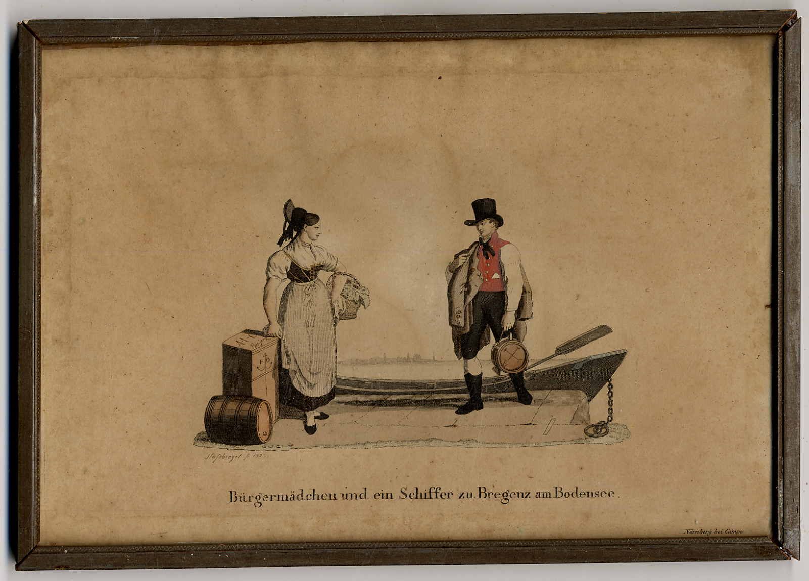 Bregenz – Bürgermädchen und ein Schiffer zu Bregenz am Bodensee. Colorierte Radierung, gestochen von Johann Nussbiegel Nürnberg, Friedrich Campe & Sohn, [1823]. Ca. 17 x 24,5 cm (Blattgröße). Gerahmt, unter Glas. Leicht fleckig. Im Vordergrund ein Bürgermädchen mit Henkelkorb mit Gemüse sowie ein Schiffer mit Kahn. Im Hintergrund die Stadtsilhouette. Seltenes Blatt des Nürnberger Kupferstechers J. Nus(s)biegel (1750-1833).