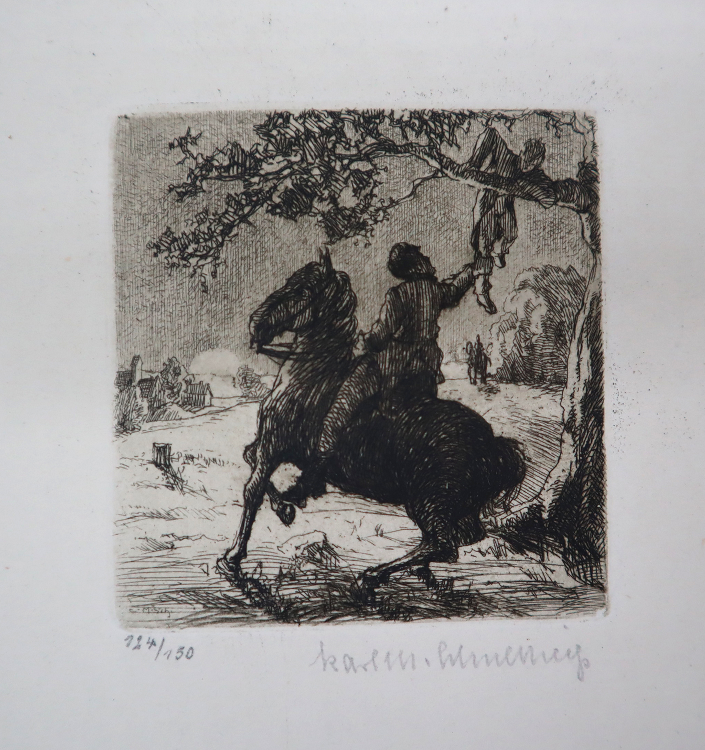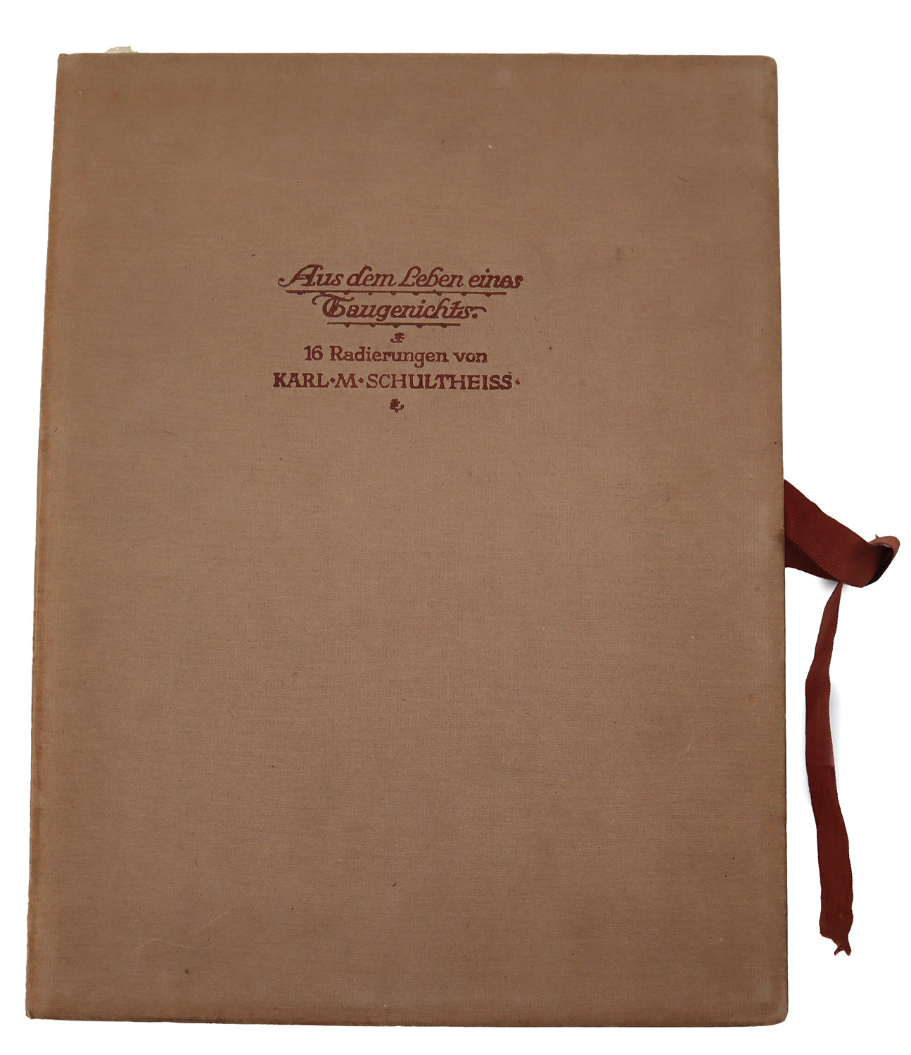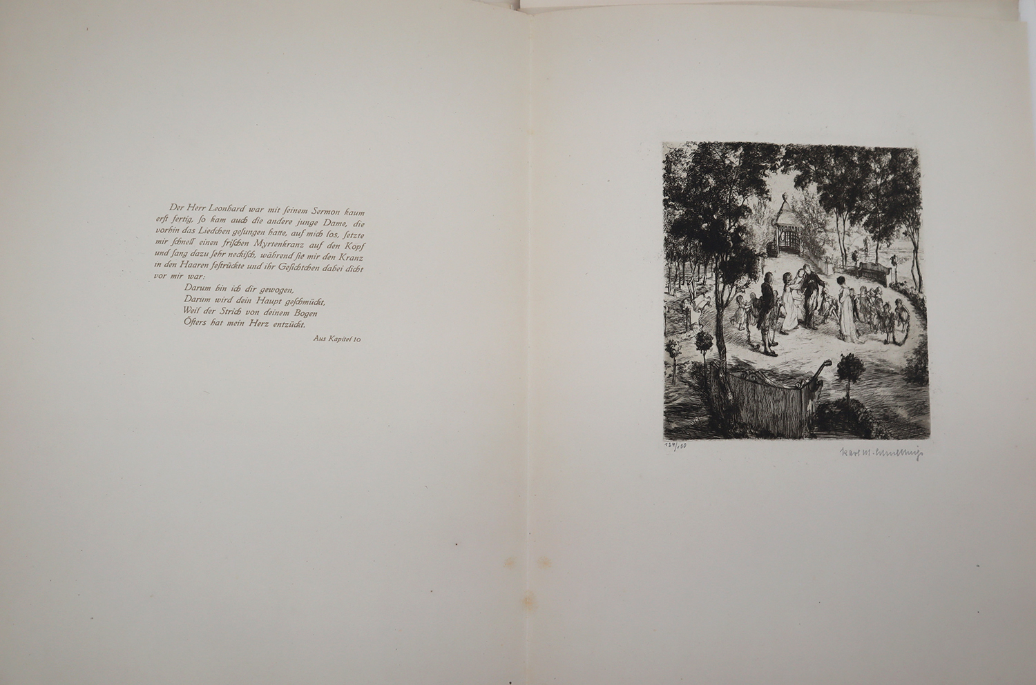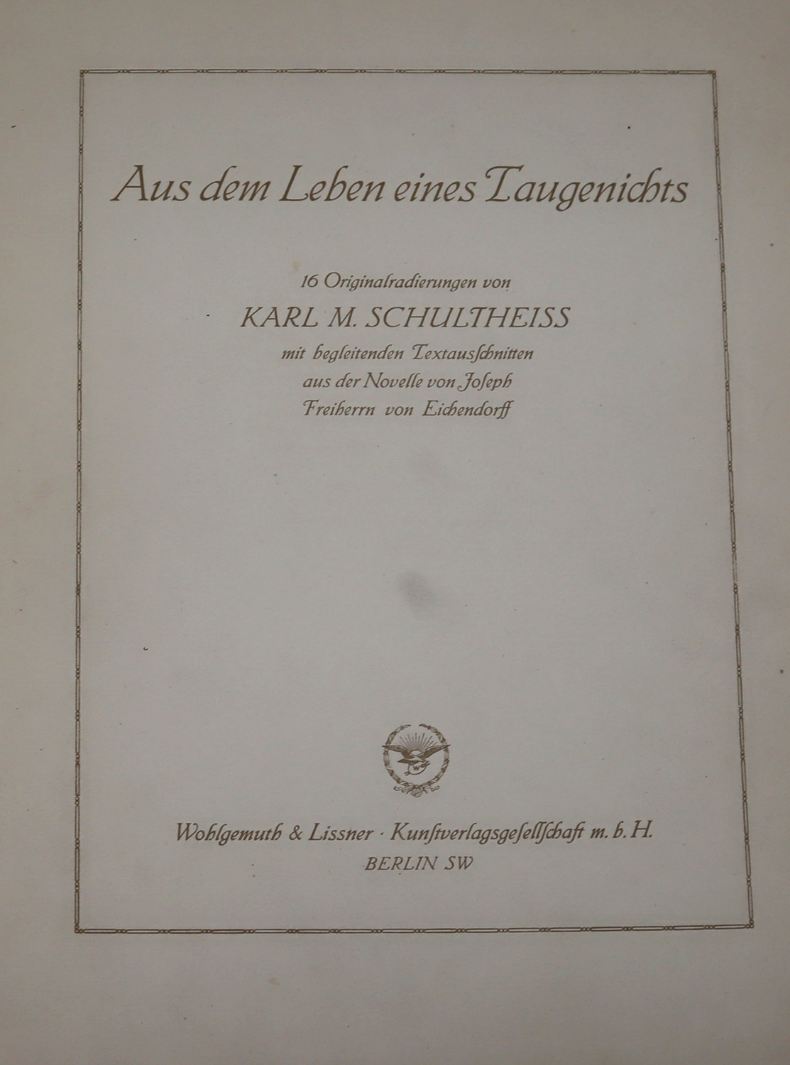 Schultheiss – Eichendorff, Joseph v.: Aus dem Leben eines Taugenichts. 10 Originalradierungen von Karl M. Schultheiss mit begleitenden Textausschnitten aus der Novelle von Joseph Freiherrn von Eichendorff. Berlin, Wohlgemuth & Lissner, Ca. 32,5 x 25 cm. 16 Doppelblätter, auf der rechten Seite jeweils mittig platziert 16 Originalradierungen von Karl M. Schultheiss. Orig.-Leinenmappe. Mappe Rücken und Kanten etwas bestoßen. Rücken der Doppelblätter etwas stockfleckig, sonst gutes Exemplar. Exemplar 123/150. Jede Radierung handschriftlich nummeriert und vom Künstler signiert. Der begleitende Textausschnitt jeweils auf der linken Seite.