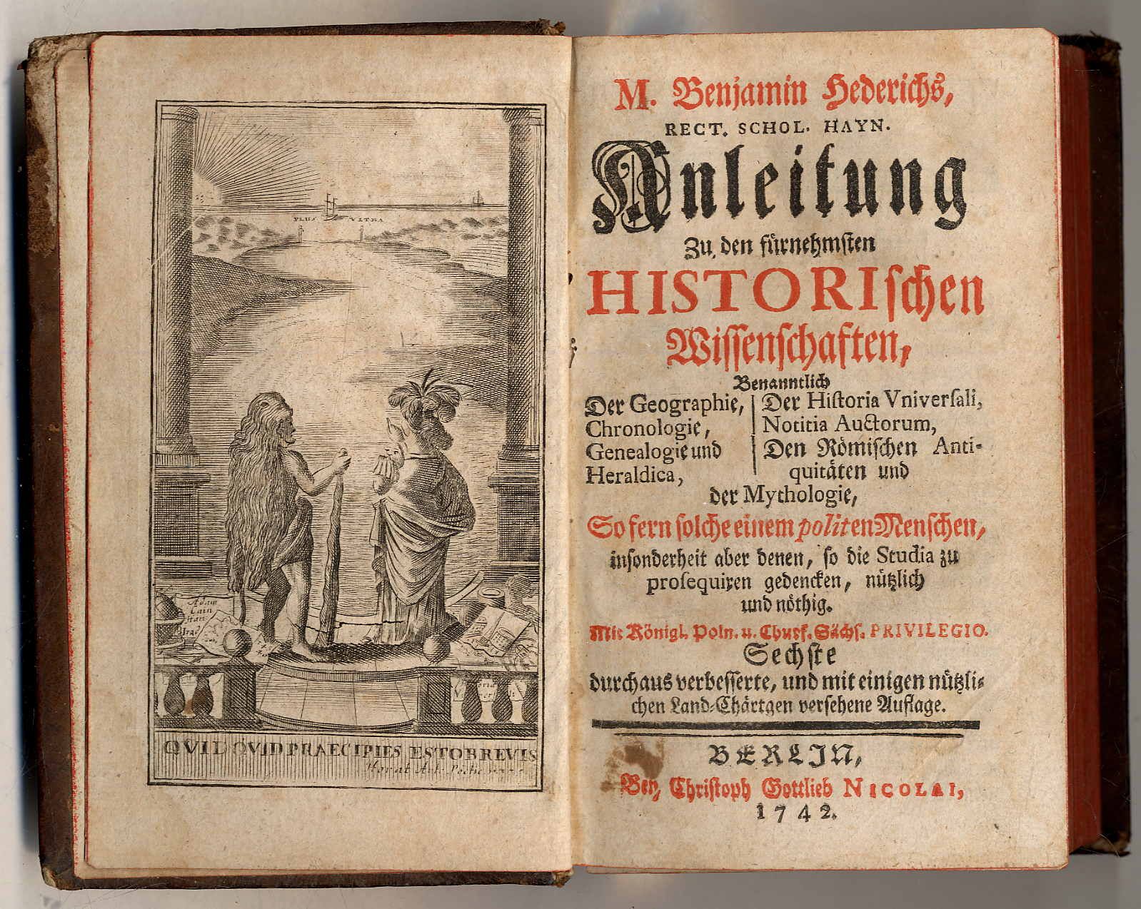 Hederich, Benjamin: Anleitung Zu den fürnehmsten Historischen Wissenschaften, Benanntlich Der Geographie, Der Historia Universali, Chronologie, Notitia Auctorum, Genealogie und Heraldik, Den Römischen Antiquitäten und der Mythologie. So fern solche einem politen Menschen, insonderheit aber denen, so die Studia zu prosequiren gedencken, nützlich und nöthig. Sechste, durchaus verbesserte, und mit einigen nützlichen Land-Chärten versehene Auflage. Berlin, Christoph Gottlieb Nicolai, 1742. Ca. 17,5 x 10,5 cm. (16) S., 512 S., (16) Seiten. Mit gestochenem Frontispiz, 3 Wappentafeln und 6 gefalteten Karten. Ledereinband der Zeit mit geprägtem Rückenschild. Rücken und Hinterdeckel mit Abrieb. Seiten teils etwas gebräunt bzw. stockfleckig.