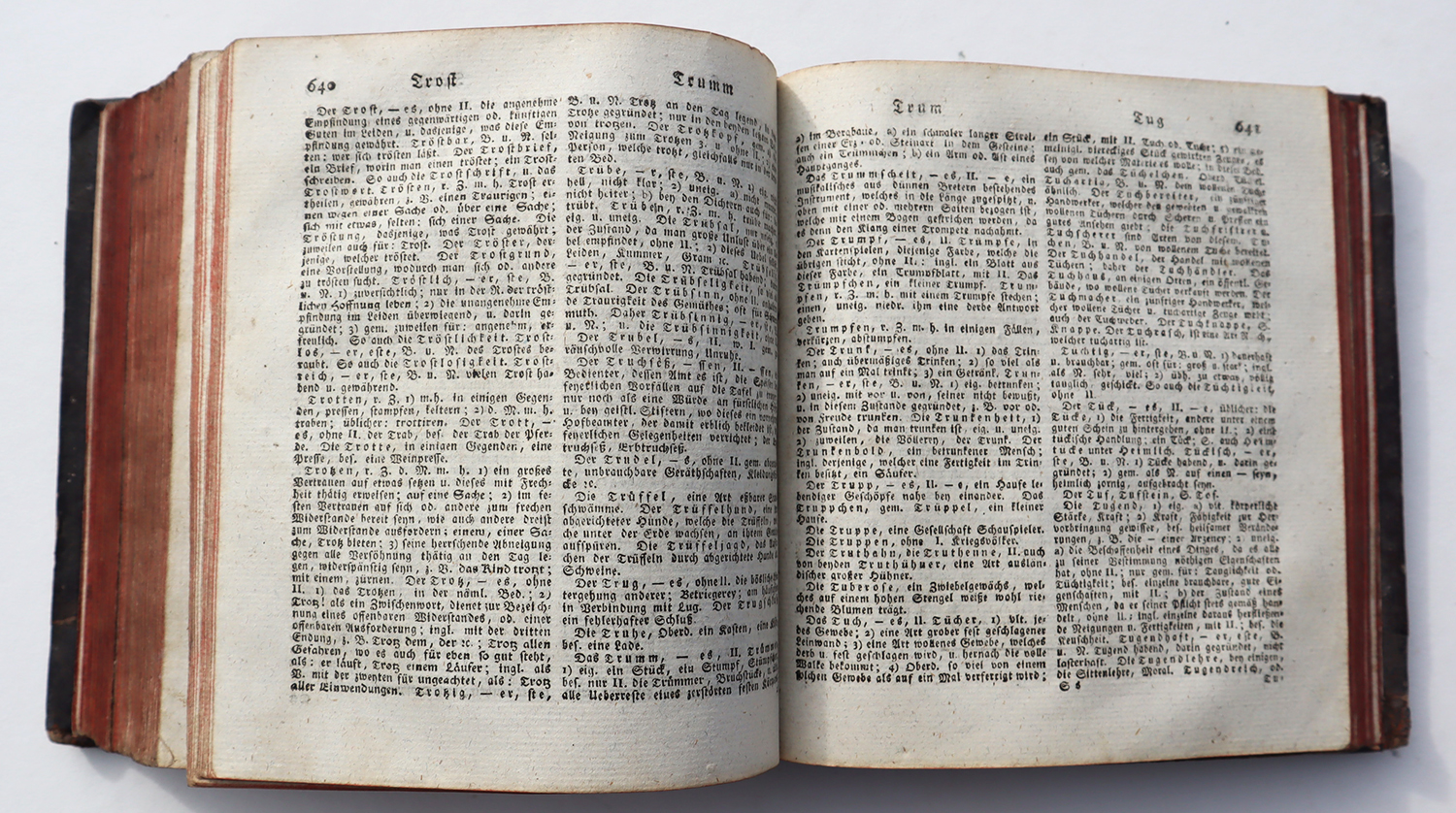 [Harnisch, Johann Christian]: Handwörterbuch der Deutschen Sprache, zum Gebrauche des Lesens, Sprechens und Schreibens, mit Angabe der nächsten sinnverwandten Wörter und einer kleinen Sprachlehre. Nach den besten Deutschen Sprachforschern. Leipzig, Christian Gottlieb Rabenhorst, 1798. Ca. 15 x 14 cm. XXXVI S., 792 Seiten. Halblederband der Zeit. Eiinband leicht berieben. Vorsätze etwas fleckig. Gutes Exemplar. „Der Antiquar, – s, II. – e, 1) einer, der mit alten Büchern handelt; 2) ein Alterthumskundiger, Alterthumsforscher.“