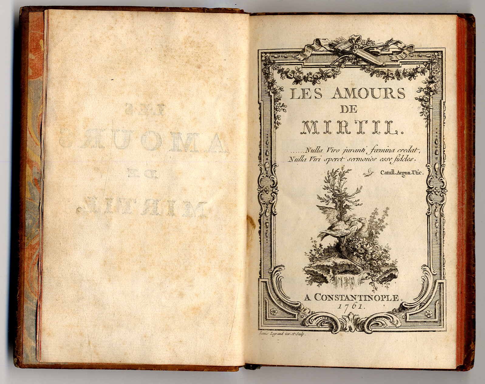 [Sacy, Claude Louis Michel de]: Les amours de Mirtiil. Constantinople [d.i. Paris, Joseph-Gérard Barbou], 1761. Ca. 15,5 x 9,5 cm. (8) S., 141 Seiten. Mit illustriertem Titel und 6 Kupferstichtafeln von Louis Legrand nach Gravelot. Ledereinband der Zeit mit Rückengoldprägung. Einbandkanten leicht bestoßen, Vorsätze etwas fleckig, jedoch gutes Exemplar. In französischer Sprache.