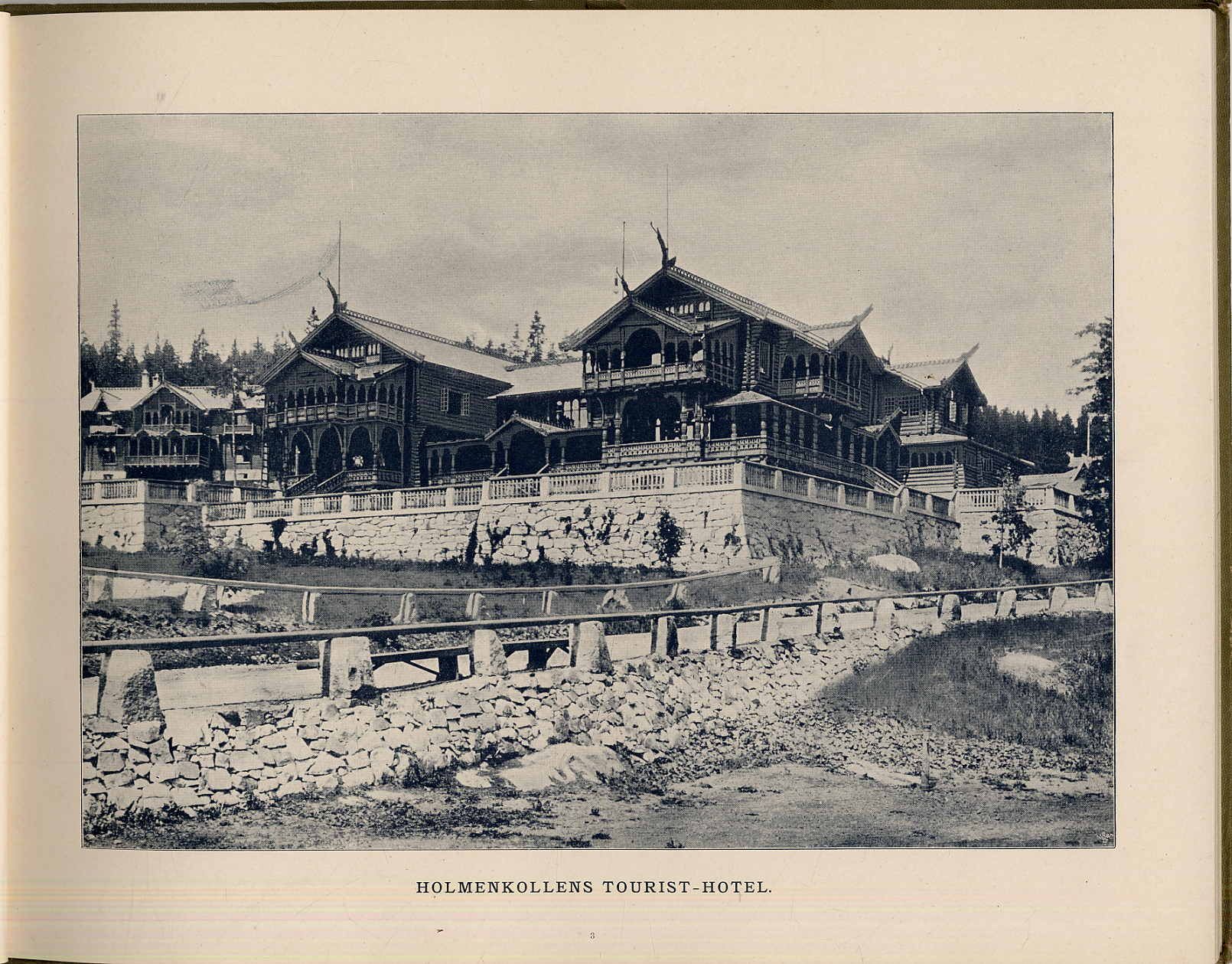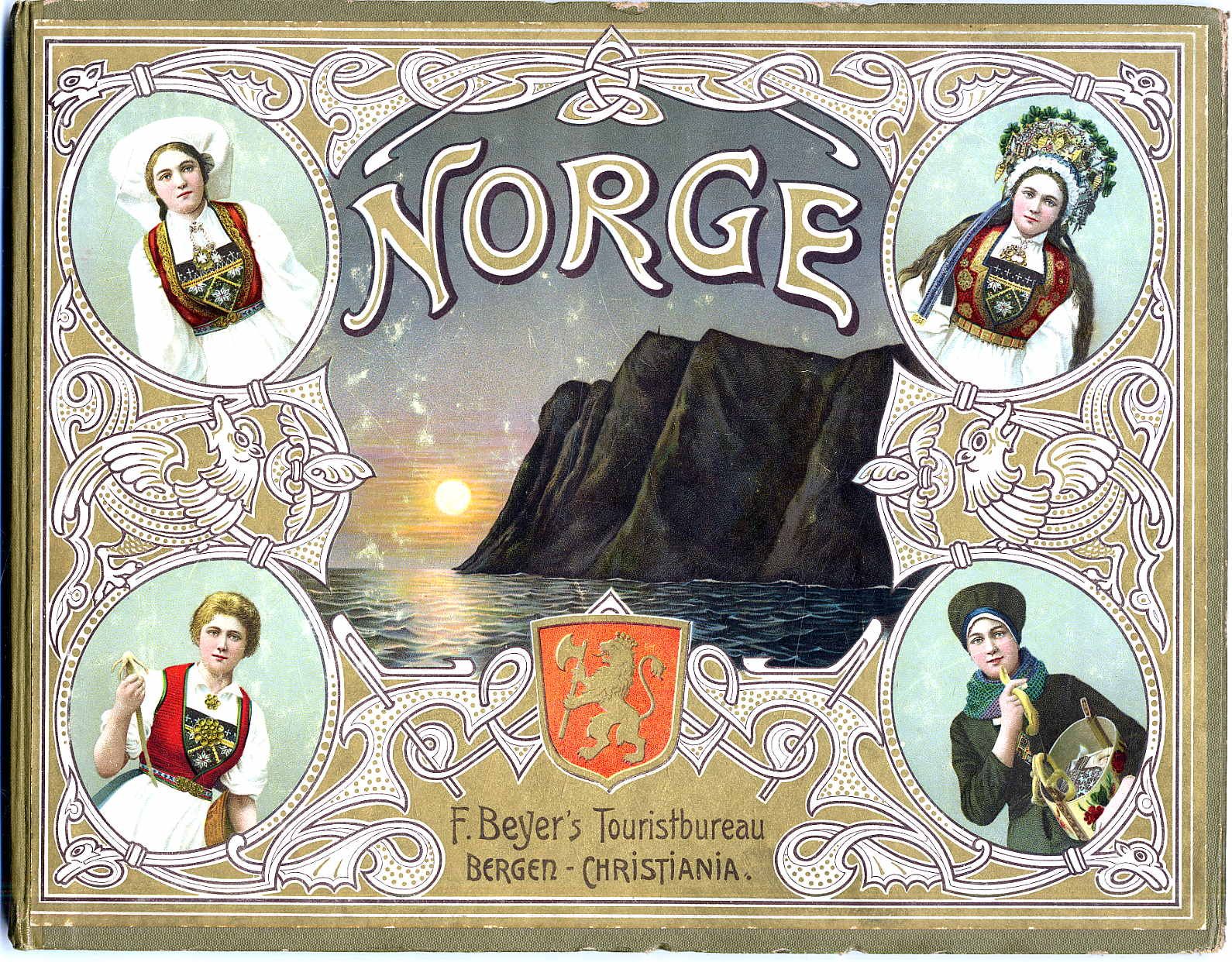Norge i billeder indeholdende 50 prospekter fra landets fleste touristruter. 2. Auflage. Bergen u.a., F. Beyer’s Tourist-Bureau, um 1900. Querformat, ca. 24 x 30,5 cm. (66) Seiten mit 50 Abbildungen auf 32 Tafeln. Farbig illustr. Orig.-Halbleinenband. Kanten leicht bestoßen, sonst gutes Exemplar.