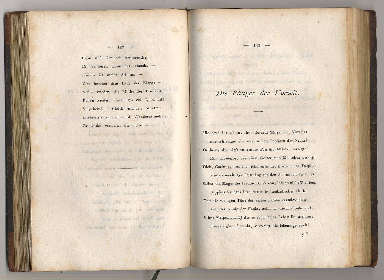 Westphalen, Christine (geb. von Axen): Gedichte. 2 Bände. Hamburg, Benjamin Gottlob Hoffmann, 1809. Ca. 20 x 13,5 cm. VIII S., 318 S., (2) Seiten, mit gestochenem Frontispiz; VIII S., 341 S., (2) Seiten, mit gestochenem Frontispiz. Etwas spätere Halblederbände mit Rückenschild. Erste Ausgabe. Pataky 428. 1803 erschien noch ein 3. Band (liegt hier nicht vor). Einbände berieben (Lederrücken stärker). Vorsätze teils braunfleckig. Seiten teils (auch stärker) stockfleckig. Engel Christiane Westphalen (1758-1840, Hamburger Schriftstellerin).