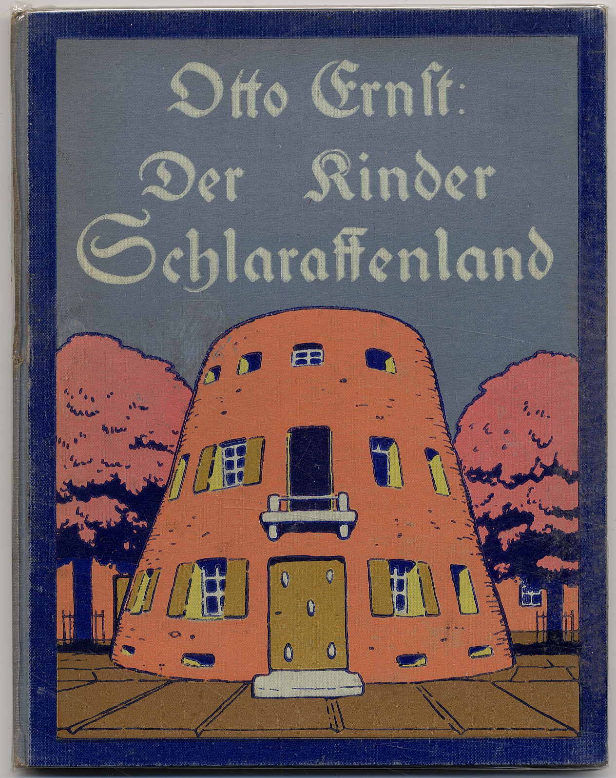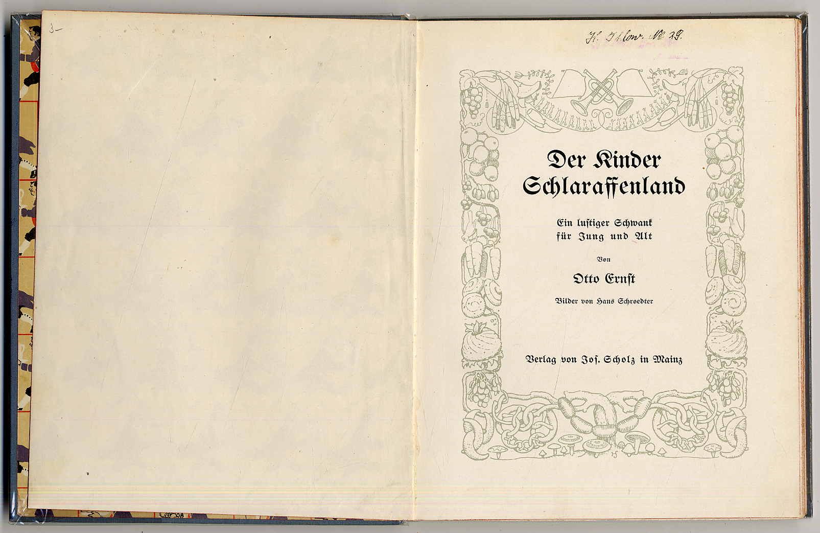 Ernst, Otto (d.i. Otto Ernst Schmidt): Der Kinder Schlaraffenland. Ein Märchen vom König Winter. Ein lustiger Schwank für Jung und Alt. Mainz, Jos. Scholz Vlg., [1910]. Ca. 23 x 18 cm. 55 S. Mit 10 farbigen Tafeln und Buchschmuck von Hans Schroedter. Farbig illustr. Orig.-Leinenband. Klotz 1313/13; Ries 869.14. Inventarvermerk auf Titelblatt. Zwei Märchen „Der Kinder Schlaraffenland“ und „Ein Märchen vom König Winter“ in einem Band.
