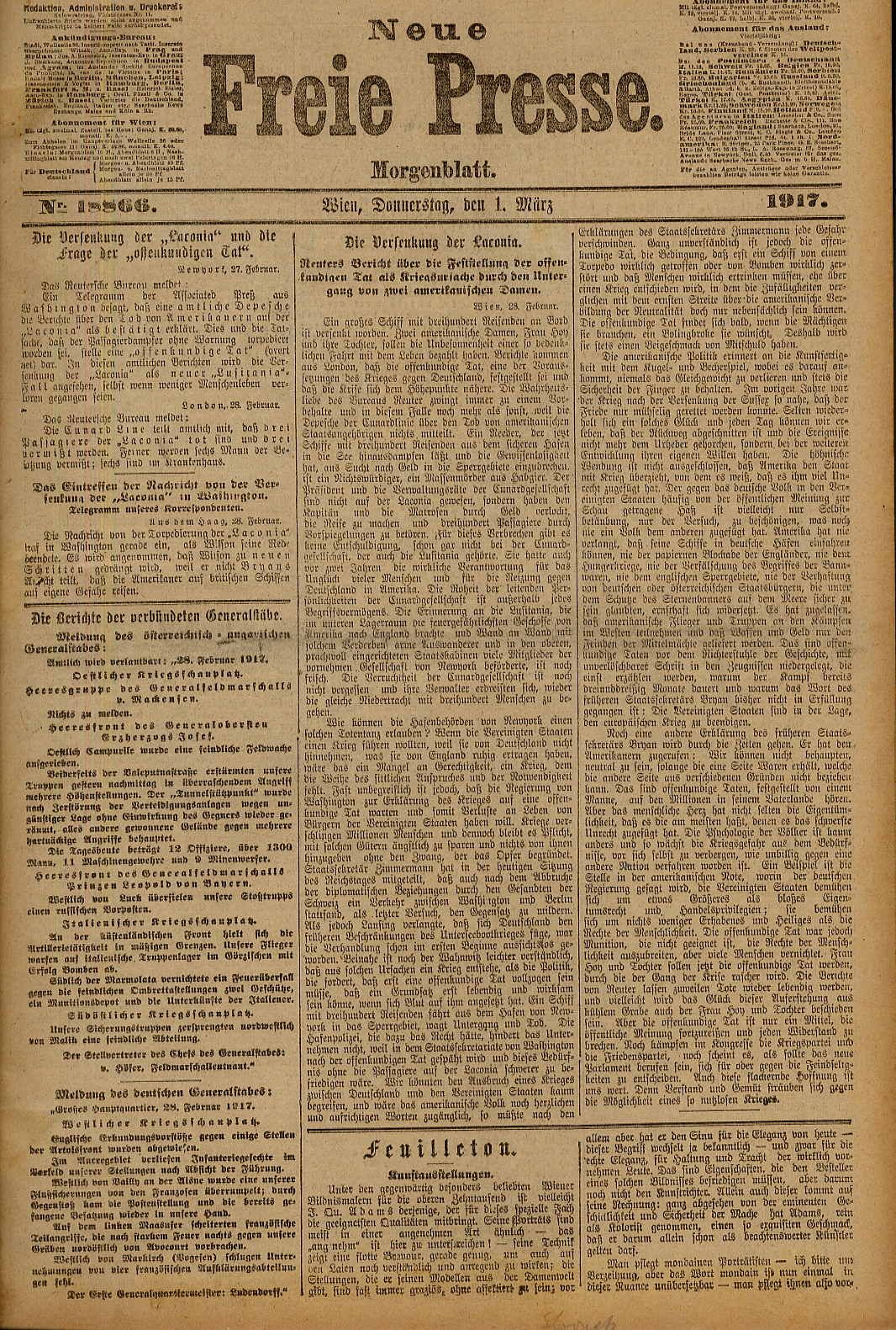 Neue Freie Presse. März 1917. Wien, 1917. Ca. 46 x 31 cm. Je Ausgabe zwischen 4 und 20 Seiten. Grüner Leineneinband mit geprägtem Deckeltitel. Hinterdeckel am unteren Rand etwas fleckig. Die „Neue Freie Presse“ wurde am 1. September 1864 von Michael Etienne und Max Friedländer gegründet und entwickelte sich zur bedeutendsten liberalen Zeitung Österreichs. Unter Chefredakteur Moriz Benedikt (1849-1920) nahm sie großen Einfluss auf die Politik und veröffentlichte Beiträge namhafter Autoren. Sie erschien zweimal täglich (es gab jedoch auch Morgen- Nachmittags- und Abendblätter) und brachte neben Politik auch Feuilletons, und Nachrichten aus der Wirtschaft sowie Werbeanzeigen. Die Zeitung erschien durchgehend bis zum 31. Januar 1939. Ab 1. Februar 1939 wurde sie mit anderen Blättern zum Neuen Wiener Tagblatt fusioniert. – In unserem Bestand befinden sich mehrere Bände dieser Zeitschrift, die Bände sind nicht durchgehend collationiert, eventuell fehlen einzelne Ausgaben.