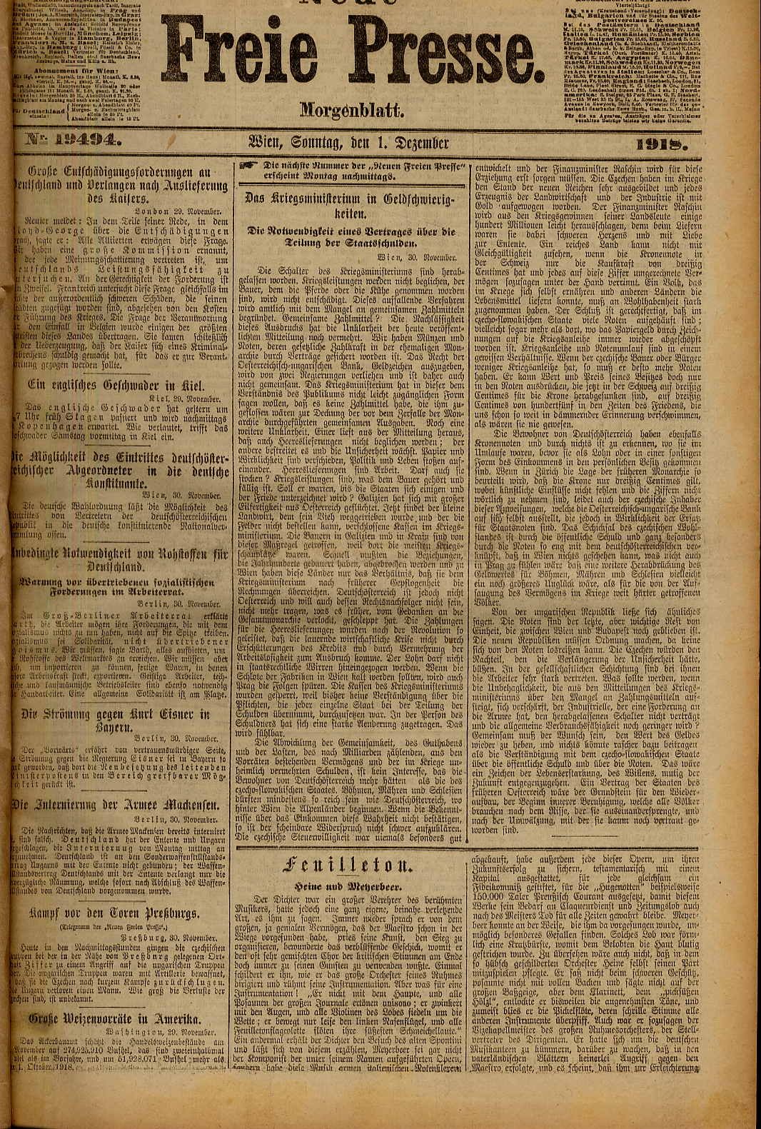 Neue Freie Presse. Dezember 1918.