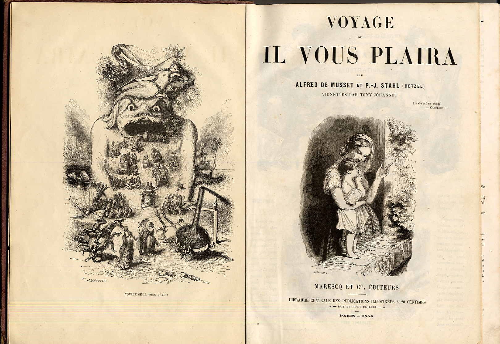 Musset, Alfred de u.a.: Voyage de il vous plaira. Beigebunden: Charles Nodier: Les chefs d’oeuvre de la litterature et de l’illustration (Teil 1 und 2). Paris, Maresco et. Cie., 1856. Ca. 30 x 22 cm. 60 Seiten, mit zahlreichen Textholzstichen von Tony Johannot sowie 37 Holzstichen auf Tafeln; 48 S., mit zahlreichen Textholstichen; 48 Seiten, mit zahlreichen Textholzstichen. Leinenband der Zeit mit goldgeprägtem Deckeltitel. Einband etwas fleckig, Rücken teils beschädigt. Innen teils etwa stockfleckig. In französischer Sprache.
