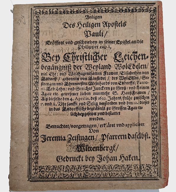 Zeising, Jeremias: Anligen Des Heiligen Apostels Pauli / Eröffnet und geschrieben in seiner Epistel an die Philipper cap. I, Bey Christlicher Leichenbegängniß der Weyland WolEdelen / viel Ehr : und Wolthugendsamen Frawen Elisabethen von Etzdorff / gebornen von Einsiedel / des WolEdlen / Gestrengen und Ehrenvesten Meinhards von Etzdorffs / Patroni Erb-Lehn : und Gerichts Junckern zu Groß– und kleinen Agau etc. gewesener lieben nunmehr S. HaußFrawen / Alß dieselben den 4. Aprilis, deß 1622 Jahrs / frühe zwischen 7. und 8. Uhr sanfft und Selig verstorben und den 12. dieses in das Etzdorffische begräbnis zu Großen Agau erlich beygesetzet und bestattet worden. Wittenbergk, gedruckt bey Johan Haken, [1622]. Ca. 17,5 x 14,5 cm. (52) Seiten. Broschur, ohne Einband. Ausgebundene Broschur. „Christliche Leichenpredigt“. Jeremias Zeising (1588-1637, Pfarrer in Wittenberg), Elisabeth von Etzdorff (1565-1622). Gutes Exemplar.