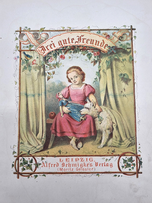 Wiedemann, Franz: Drei gute Freunde. Zwölf allerliebste Bilder aus dem Kindesleben. Zweite Auflage. Leipzig, Alfred Oehmigke, [1873]. Ca. 28,5 x 21,5 cm. (52) Seiten, mit farblithographiertem Titel sowie 12 ganzseitigen Farblithographien von Johann Baptist Sonderland. Farbig illustr. Orig.-Halbleinenband. Ries 889,2. Einband gebräunt und etwas fleckig, Kanten bestoßen. Seitenränder etwas fingerfleckig, kleinere Randeinrisse sauber hinterlegt. Die drei Freunde sind ein kleines Mädchen, Spitz der Hund und ein Püppchen im blauen Kleid.