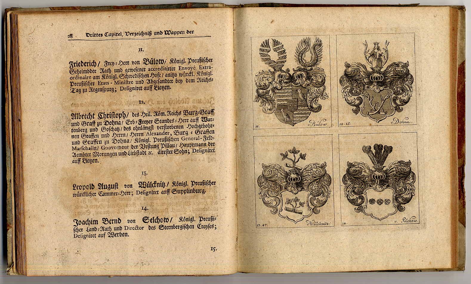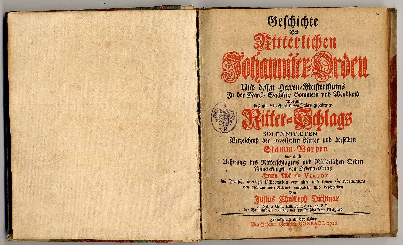 Dithmar, Justus Christoph: Geschichte Des Ritterlichen Johanniter-Orden Und dessen Herren-Meisterthums In der Marck/ Sachsen/ Pommern und Wendland. Worinn des am VII. April dieses Jahrs gehaltenen Ritter-Schlags Solennitaeten Verzeichniß der investirten Ritter und derselben Stamm-Wappen wie auch Ursprung des Ritterschlagens und Ritterlichen Orden Anmerckungen von Ordens-Creutz Herrn Abt de Vertot ins Teutsche übersetzte Dissertation vom alten und neuen Gouvernement des Johanniter-Ordens enthalten und beschrieben. Franckfurth an der Oder, Johann Gottfried Conradi, 1729. Ca. 21 x 17 cm. (14) S., 96 S., (6) Seiten. Mit 2 großen Textkupfern und 51 Wappenabbildungen auf 12 Tafeln. Halbpergamentband der Zeit. VD18 10210415. Kleiner Stempel auf Titelblatt. Die Frontispiz-Tafel „Vom Ritterlichen Ordens-Creutz“ ist beim Text vor Seite 37 eingebunden. Dithmar (1678-1737, Kameralist), wirkte neben seiner Professur in Frankfurt/Oder als Rat des Johanniterordens für die nahegelegene Kommende Sonnenburg und war Mitglied der königlichen Gesellschaft der Wissenschaften in Berlin. (Heinrich Grimm, NDB 3, S. 746). Gutes Exemplar.