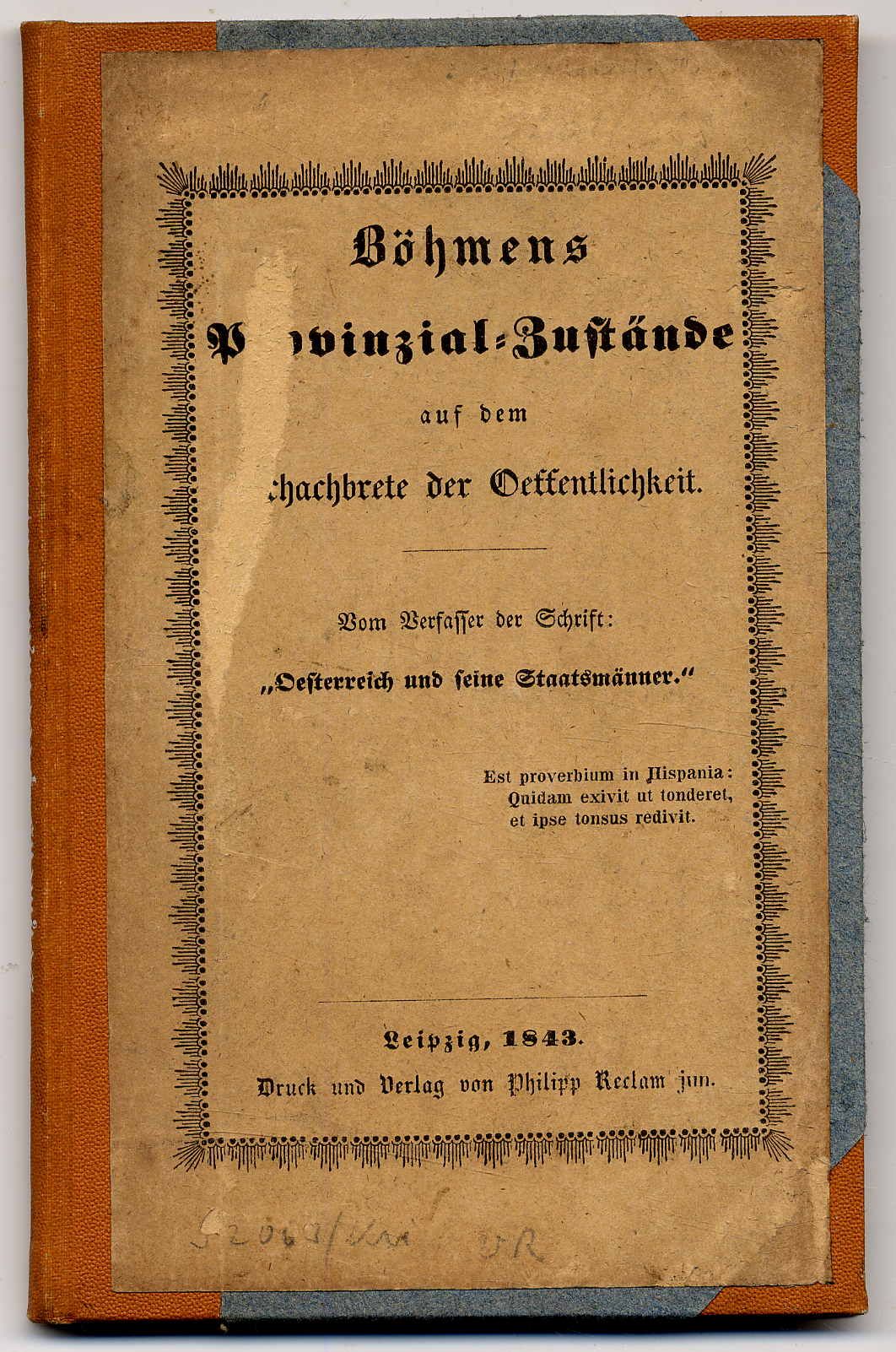 [Schirndinger von Schirnding, Ferdinand Leopold]: Böhmens Provinzial-Zustände auf dem Schachbrete (!) der Oeffentlichkeit. Vom Verfasser der Schrift: „Oesterreich und seine Staatsmänner.“ Leipzig, Philipp Reclam jun., 1843. Ca. 17,5 x 11 cm. 59 Seiten. Halbleinenband mit aufgezogenem Deckeltitel. Mit fotografischem Exlibris des Wiener Buchwissenschaftlers und Bibliothekars Moriz Grolig (1873-1949). Einband etwas berieben, Seiten leicht stockfleckig.