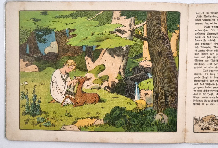 Grimm – Brüderchen u. Schwesterchen. Scholz’ Künstler-Bilderbücher Nr. 11. Mainz, Jos. Scholz, ca. 1926. Ca. 22 x 28,5 cm. (16) Seiten mit farbig illustriertem Titelblatt, Textillustrationen und 8 ganzseitigen farbigen Bildern (Algraphien) von Franz Müller-Münster. Farbig illustr. Orig.-Halbleinenband. Erste Ausgabe. Ries 864,2; Ries „Das deutsche Bilderbuch“ S. 126 ff. Vorderdeckel: Vertikale Leisten mit Zauberer, Krone, Vogel und Farbillustration. Vorsatz Blumenkörbchen. Einbandkanten etwas bestoßen. Namenszug auf Titelblatt. Seitenränder etwas fingerfleckig.
