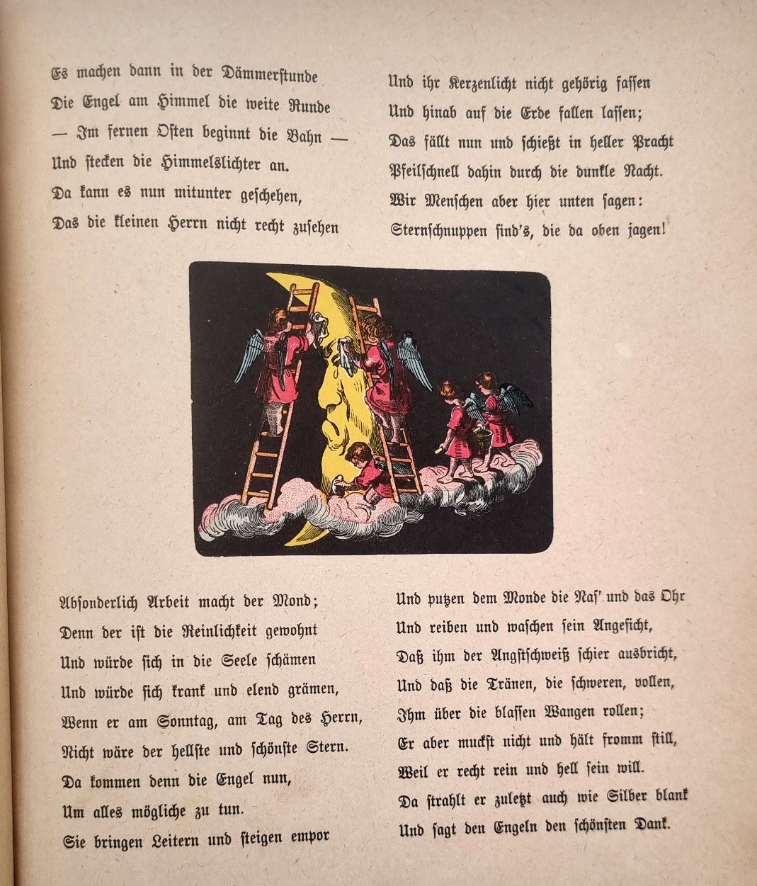 Hoffmann, Heinrich: Im Himmel und auf der Erde. Herzliches und Scherzliches aus der Kinderwelt. 20. Auflage. Frankfurt, Literar. Anstalt Rütten & Loening, [1925]. ca. 26 x 22 cm. 26 S. Mit farbigen Illustrationen. Orig.-Pappband. Vgl. Bilderwelt 312 (19. Aufl. um 1923). Rücken und Innendeckel erneuert. Am Falz mit Papier verstärkt. Seiten minimal fingerfleckig.