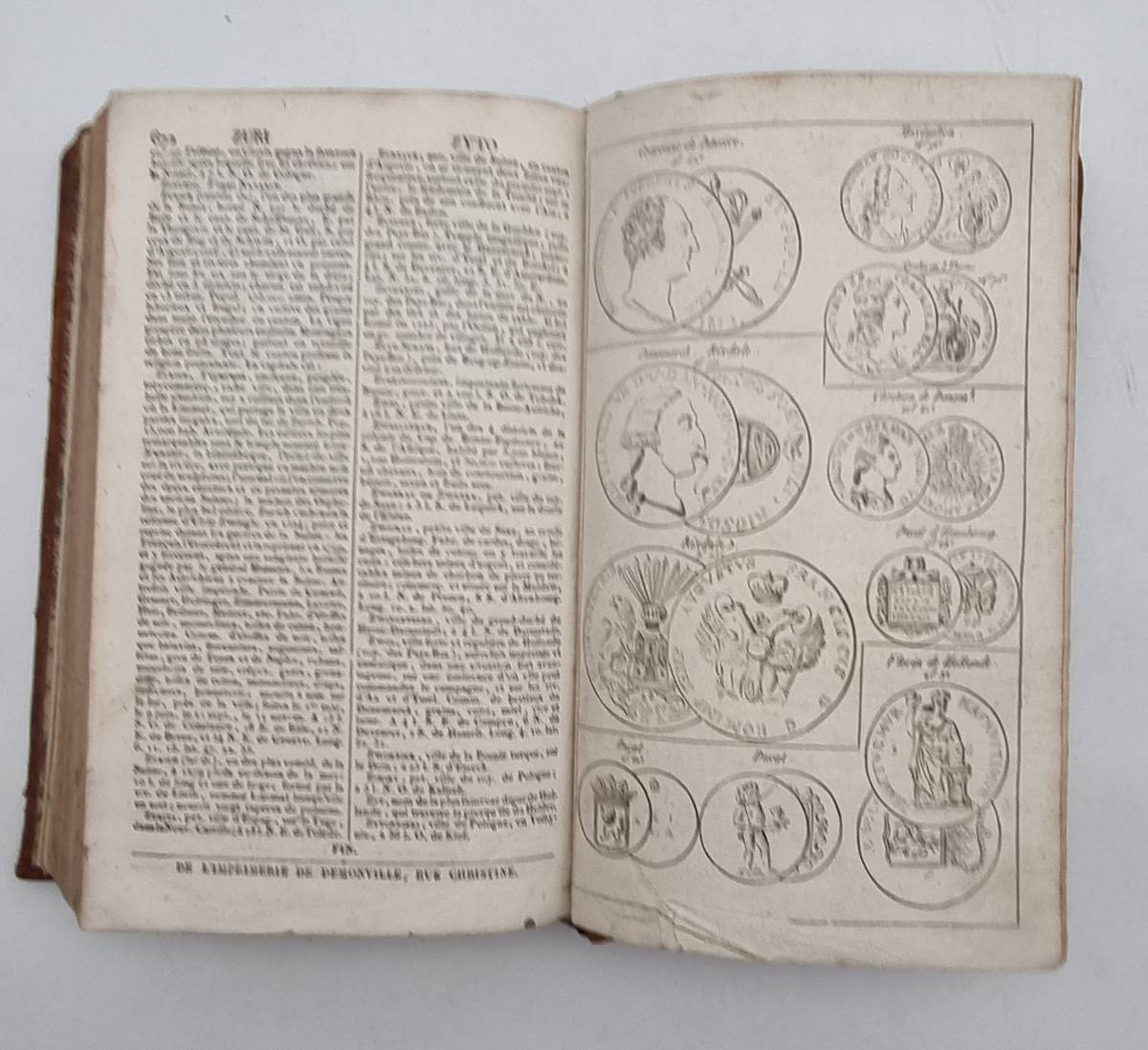 Vosgien – Goigoux – Dictioinnaire Géographique, ou description de toutes les parties du monde par Vosgien. Nouvelle Édition … précédée d’un précis de geographie par J. D. Goigoux. Paris, Menard et Desenne u. Ledentu, 1823. Ca. 21 x 13 cm. VII S., 672 Seiten. Mit 7 gestochenen Kupferstichkarten (davon eine mit zusätzlich 20 handcolorierten Flaggenabbildungen), 6 Tafeln mit Münzabbildungen. Halblederband der Zeit mit Rückengoldprägung. Rücken neu mit Leder unterlegt. Kleiner Aufleber auf Innendeckel, alter Namenszug auf Vorsatz. Minimal stockfleckig. Die Karten: 2 Weltkarten mit kleiner Umlaufbahn der Erde um die Sonne; Royaume de France (hier am Rand die farbigen Flaggen verschiedener Länder); Carte d’Afrique 1823; Amérique méridionale 1823; Amérique septentrionale 1823; Carte d’ Asie 1822; Carte d’Europe 1823.