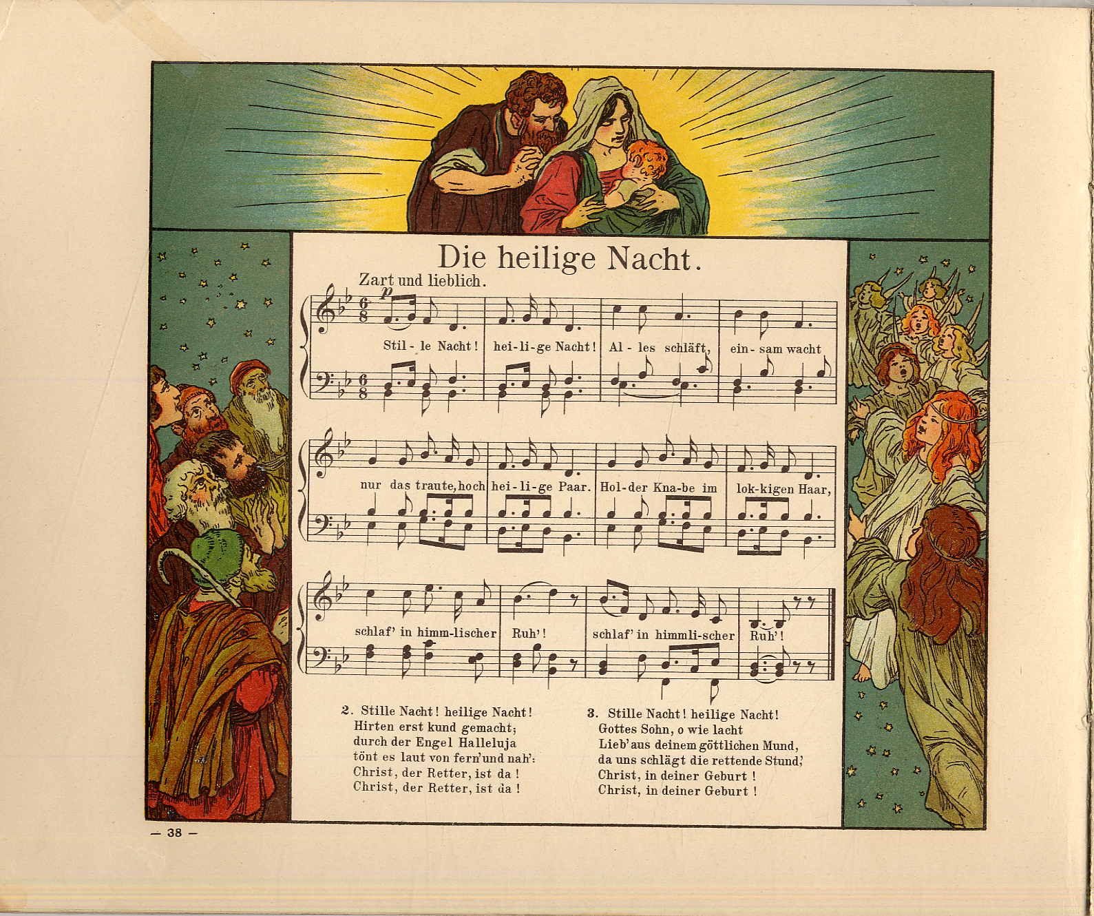 Merck, Friederike: Unser Liederbuch. Die beliebtesten Kinderlieder ausgewählt. Für Kinderstimmen gesetzt von Fritz Volbach. 1. Band. Mainz, B. Schott’s Söhne, 1900. Querformat, ca. 21,5 x 25,5 cm. 47 S. Mit zahlreichen farbigen Lithographien von Ludwig von Zumbusch. Orig.-Halbleinenband. Ries 993 und 308: „… zeigen … den nahtlosen Übergang aus der chromolithographischen Technik in die sorgfältig gearbeitet farbige Lithographie der Zeit um und nach 1900.“ Schnitt am unteren Eck etwas fleckig, sonst gutes Exemplar.