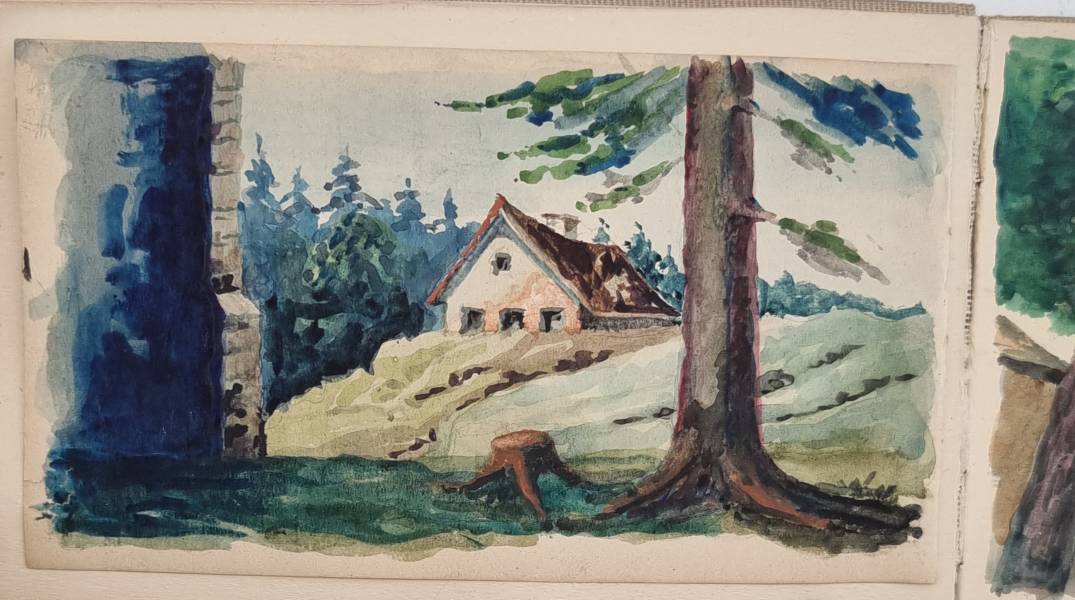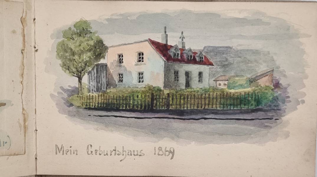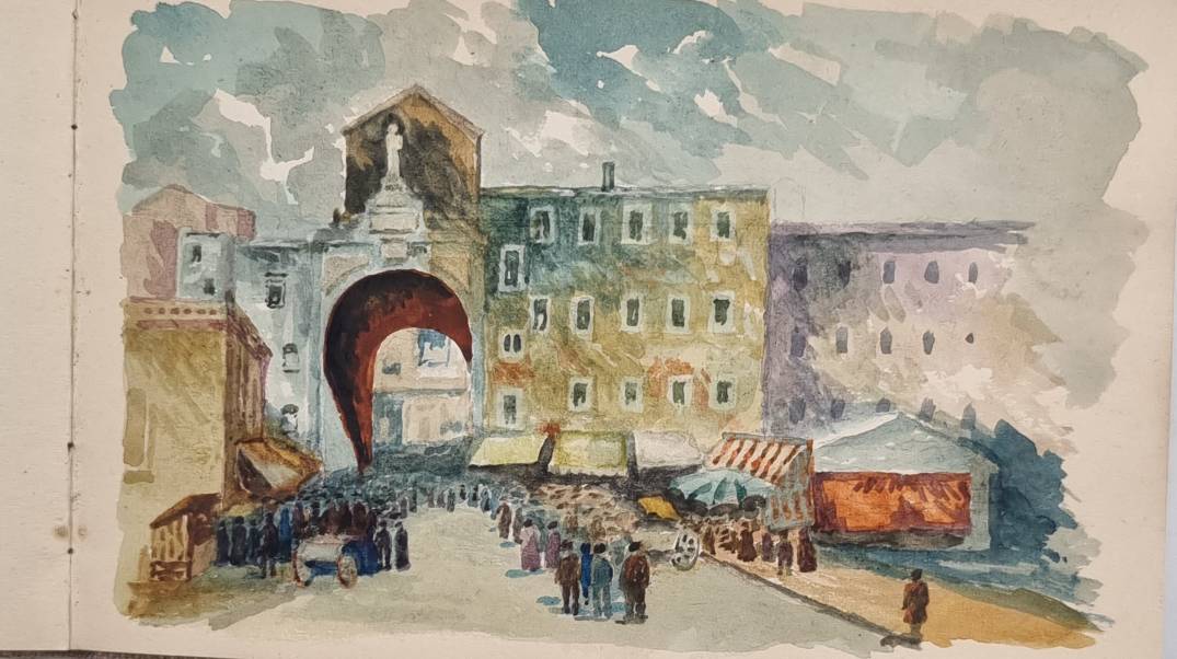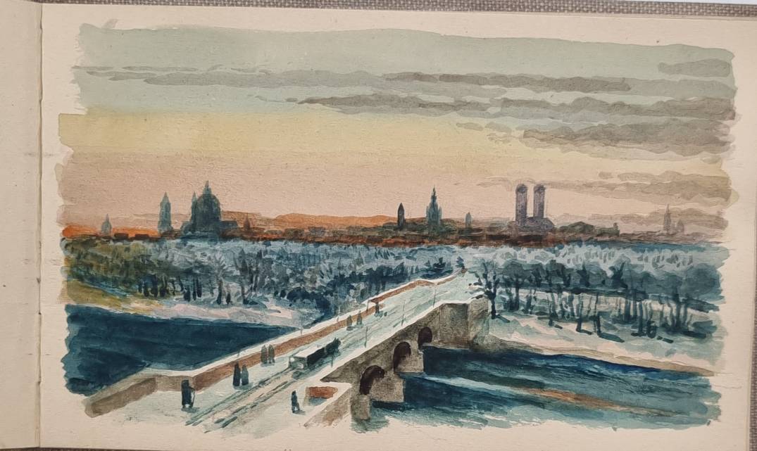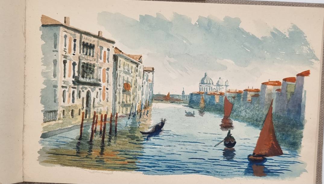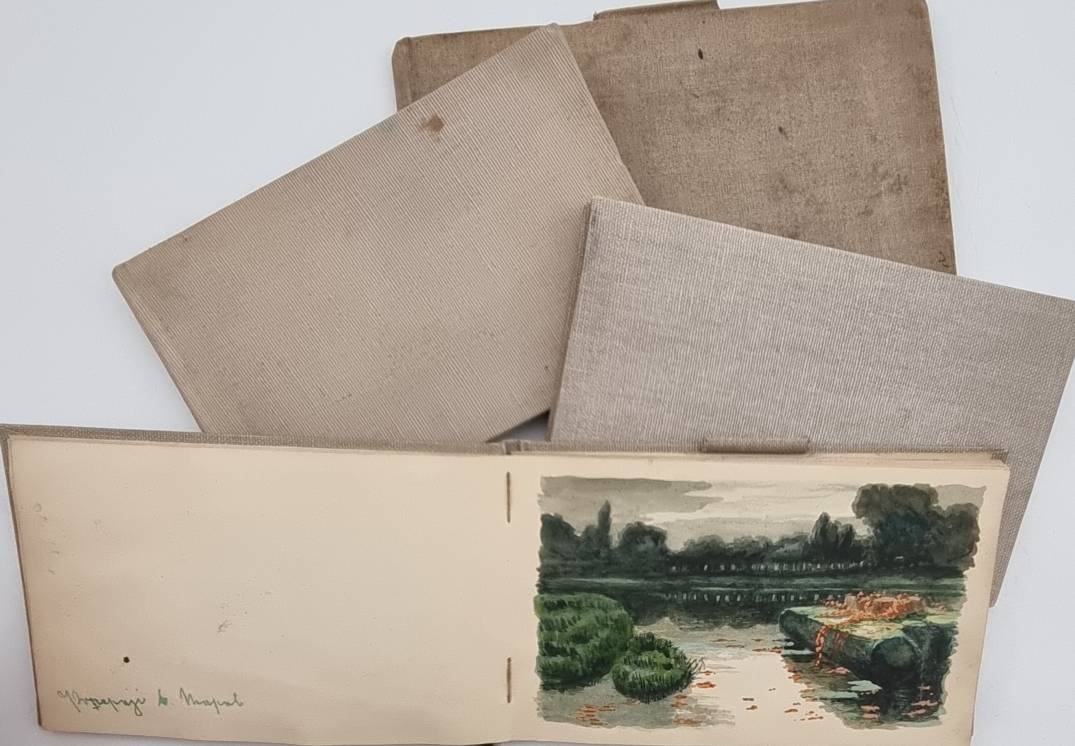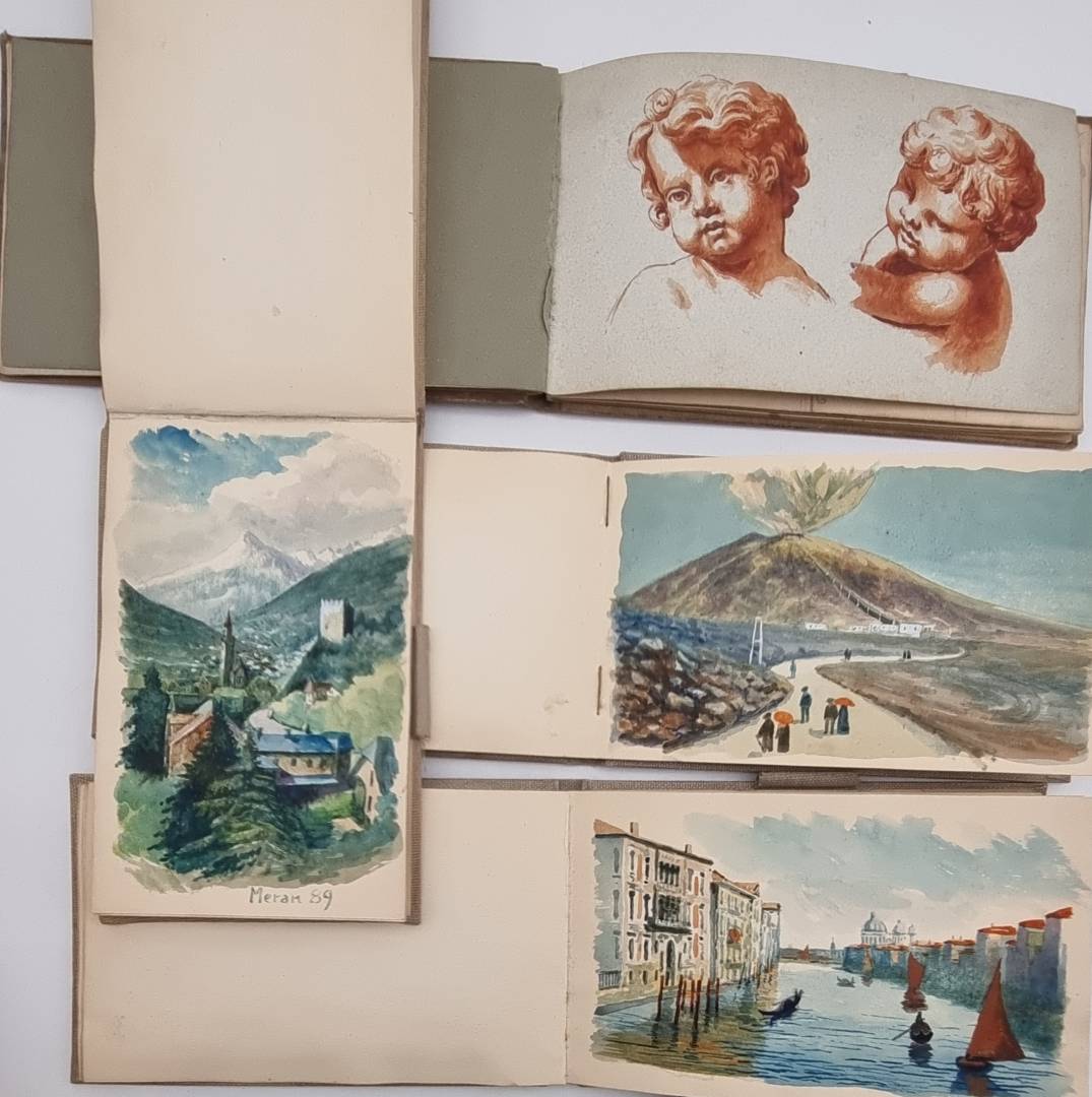 Leipoldt, Otto: Aus meinen Wanderungen. (3 Bände und ein Studienbuch). 4 Skizzenbücher eines Leipziger Künstlers. Mit mehr als 110 Aquarellen und Zeichnungen. 1869-1892. Querformat ca. 12 x 18,5 cm bzw. 12,5 x 20,5 cm. Graue Leineneinbände der Zeit. Auf den Innendeckeln mit Stempel „Otto Leipoldt Leipzig Sebastian Bach Str. 17“ und handschriftlichem Titel „Aus meinen Wanderungen“ sowie Datierung 1932. Das Einwohneradressbuch für Leipzig aus dem Jahr 1932 verzeichnet unter dieser Adresse einen „Otto Leipoldt“ mit der Berufsbezeichnung „Vertr[eter]. Die Bilder teils mit Datum versehen (1869-1892) und häufig mit Ortsangabe. Band I: Mit 27 Aquarellen u.a. London, Cornwall, Dartmouth, Rotterdam, Hamburg, München, Dillingen, St. Gotthart, Comer See, Lago Maggiore, Neapel; Band II: 30 Aquarelle u.a. „Mein Geburtshaus Rossmässlerstr. 8 (früher Waldstraße), Pleisenburg, Dresden, Görlitz, Alt Plauen, Burgstein, Werratal, Bremen, Meran, Hamburg, Holstein; Band III: Mit 26 Aquarellen, u.a.: Neapel, Rom, Florenz, Venedig; Band IV: Skizzenbuch: Mit ca. 30 Bleistiftzeichnungen mit Architektur- und Inndendekoration-Details sowie Kinderstudien und Schloß Ambras. Die Aquarelle sind von starker Farbigkeit und teils sehr stimmungsvoll.