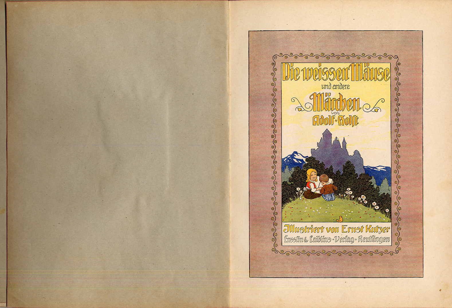 Holst, Adolf: Die weissen Mäuse und andere Märchen. Reutlingen, Ensslin & Laiblin, o.J., um 1920. Ca. 30 x 22,5 cm. 36 Seiten. Mit zahlreichen (davon 2 ganzseitigen) farbigen Illustrationen von Ernst Kutzer. Farbig illustr. Orig.-Halbleinenband. Shindo 63. Wie bei Shindo beschrieben hier eine Ausgabe mit nicht illustrierten Vorsätzen, das erste Märchen trägt den Titel „Die weißen Mäuse oder Der Hofball“ und im Inhaltsverzeichnis ist dieses Märchen nur mit „Der Hofball“ betitelt. Weitere Märchen sind: Der Schmetterling, Min Amsel, Der echte Borsdorfer, Pusselmann und Lazi, Das Büdnis, Jack der Ausreißer. Mit Exlibris. Klammerung etwas angerostet und Einbandkanten etwas bestoßen, jedoch gutes Exemplar dieses reizvoll illustrierten Bilderbuches.