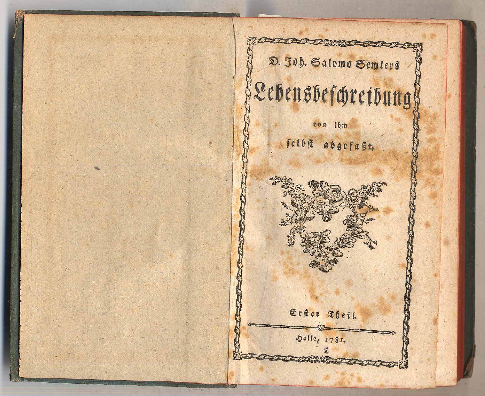 Semler, Salomo: Lebensbeschreibungvon ihm selbst abgefaßt. Halle, 1781. Ca. 20 x 12,5 cm. (32) S., 352 Seiten. Pappband der Zeit. Der 2. (hier nicht vorliegende) Teil erschien 1782. Einband etwas berieben. Seiten teils stockfleckig (anfangs stärker). Jede Seite mit Schmuckrand. Johann Salomon Semler (1725-1791, evangelischer Theologe) „zählt zu den bedeutendsten dt. ev. Theologen der Aufklärungszeit und eröffnete der prot. Theologie durch seine Vielseitigkeit auf zahlreichen Gebieten neue Wege. Durch die sein Denken kennzeichnende konsequente Historisierung seiner theol. Erkenntnisarbeit und den damit verbundenen methodischen Zugriff auf seine Quellen wurde er zu einem der Begründer und maßgeblichen Vertreter der historisch-kritischen Forschung in Deutschland im 18. Jh.“ (Dirk Fleischer in NDB 24 S. 236-237).