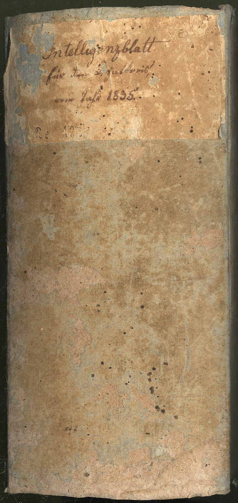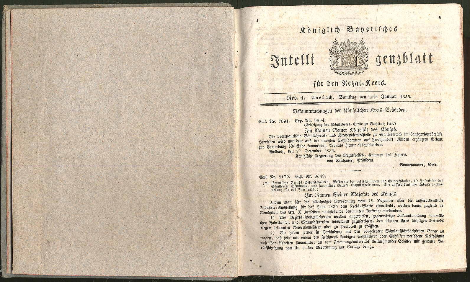 Königlich Bayerisches Intelligenzblatt für den Rezat-Kreis. Nro. 1 3ten Januar 1835 bis 30ten Dezember 1835. Ansbach, 1835. Ca. 22,5 x 20 cm. 2.752 Spalten + Extra-Beilagen zu den Rezat-Kreis-Intelligenz-Blatt (jeweils zwischen 16 und 96 Seiten); 94 Spalten Register. Pappband der Zeit mit handschriftlichem Rückenschild. Nicht eingehend collationiert. Amtliches Intelligenzblatt zur Bekanntmachung verwaltungs-, gerichts- und gemeindebezogener Mitteilungen, Versteigerungen, Vorladungen, pfarramtlichen Anzeigen, Protokollen, Polizeimitteilungen etc. im 19. Jahrhundert, hier speziell für den Rezat-Kreis, dem nach dem Fluss Rezat benannter Verwaltungsbezirk des Königreichs Bayern mit dem Verwaltungssitz Ansbach, der große Teile Frankens umfasste und 1838 im Zuge der Verwaltungsreformen in Mittelfranken überging. Aus dem Inhalt u.a.: Die Verfertigung von Frauenkleidern durch Frauenspersonen betreffend; Versteigerung der Immobilien des Bauern Nikolaus Albert zu Tiefenstockheim; Bekanntmachung der Steinfuhren aus den Zeilberg; Ueber die Verhütung von Viehseuchen; Programm … Oktober-Feste in München 1835; Die Industrie-Ausstellung vom Jahr 1834 betreffend; Vollzug der revidirten Brandversicherungs-Ordnung; Durchschnitts-Normal-Preise von sämtlichen königlichen rentämtern des Rezat-Kreises. Eine Fülle an heimatkundlichen Nachweisen, mit einem Ortsregister erschlossen.